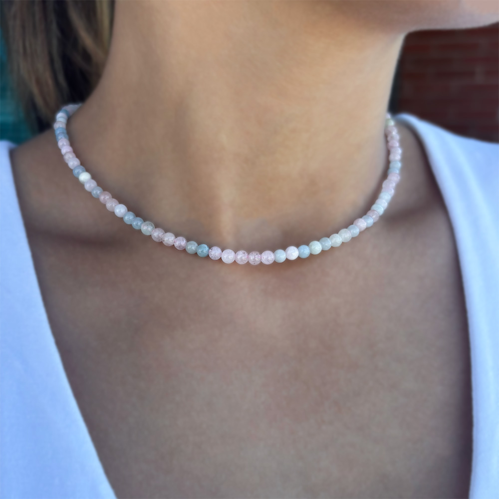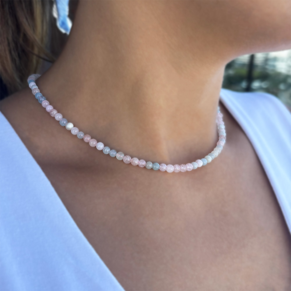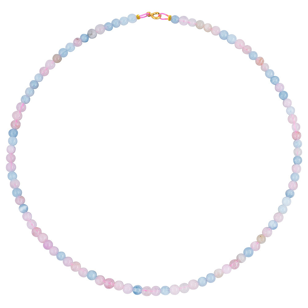 • Ένα υπέροχο κολιέ με ημιπολύτιμο λίθο morganite διαμέτρου χιλιοστών, λείας κοπής.