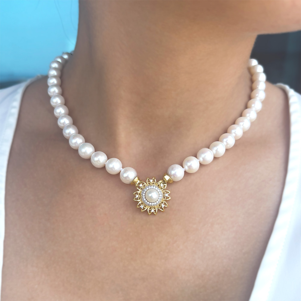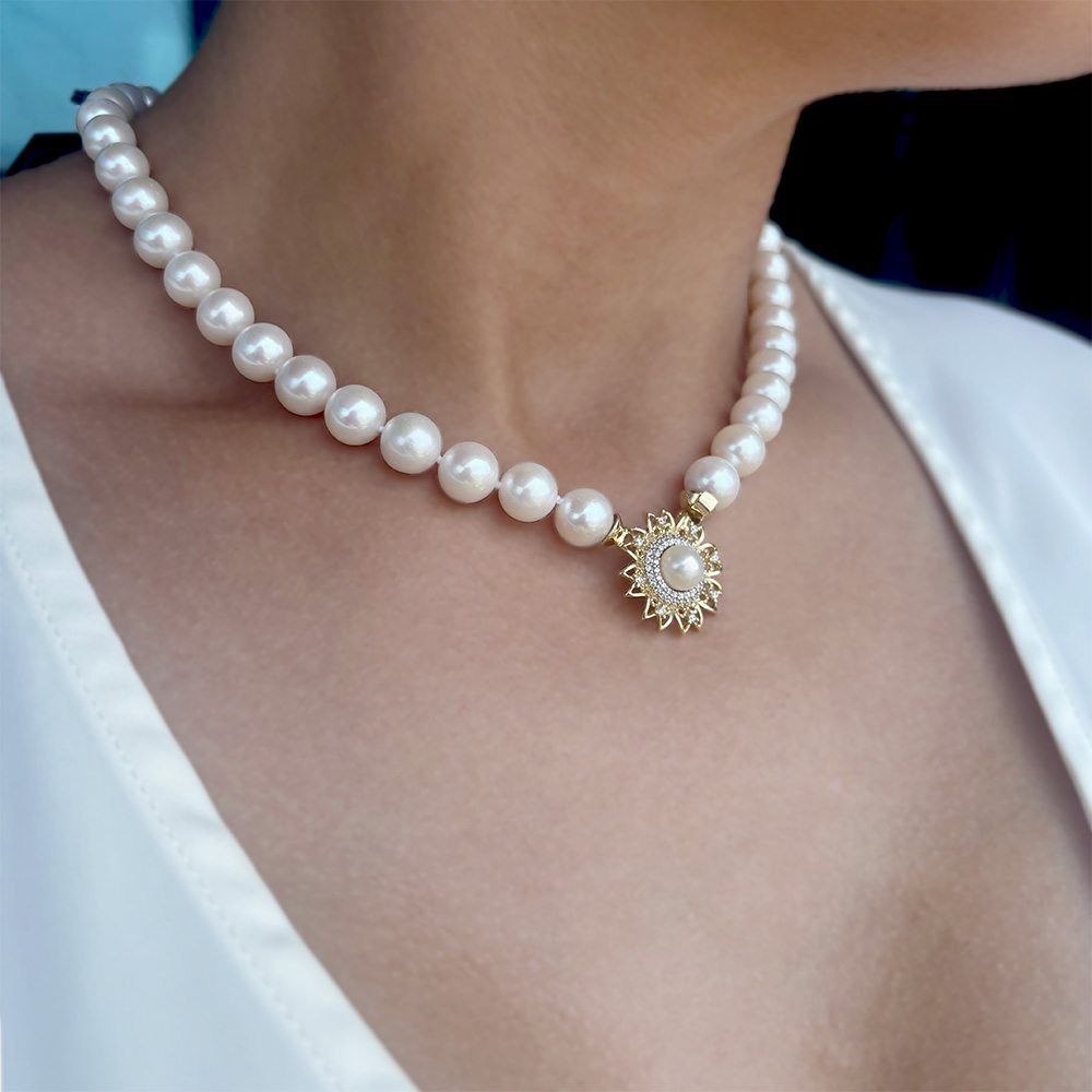 • Ένα εντυπωσιακό και μοναδικό κολιέ με λευκά στρόγγυλα μαργαριτάρια Fresh Water Pearl διαμέτρου 9-10 χιλιοστών.