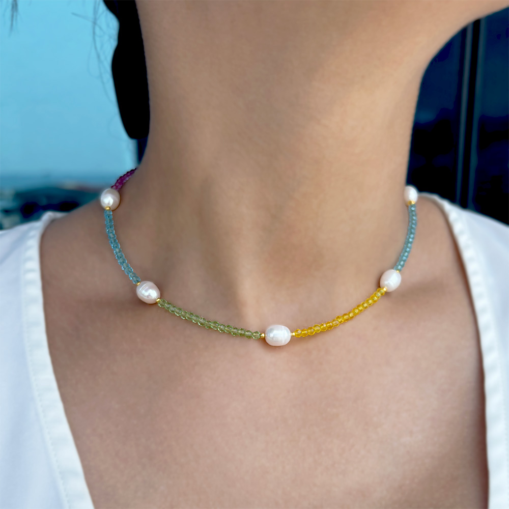 Ένα εντυπωσιακό κολιέ που συνδυάζει τα χρώματα του καλοκαιριού με το λευκό των μαργαριταριών.