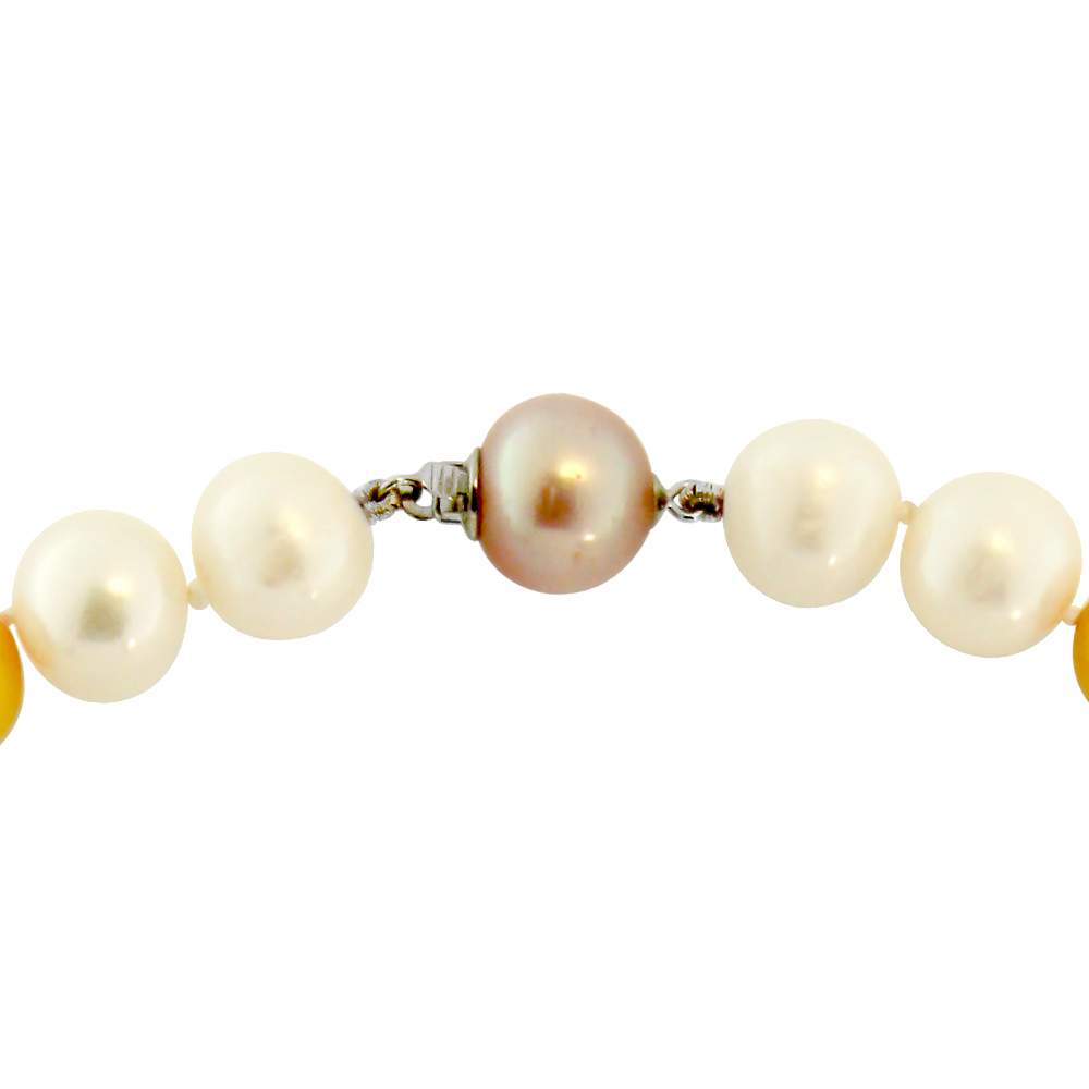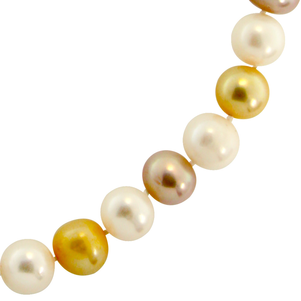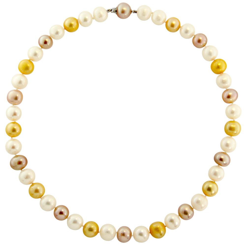 • Ένα υπέροχο κολιέ απο πολύχρωμα (λευκά, σομόν και Gold) εντυπωσιακά μαργαριτάρια γλυκού νερού Fresh Water Pearl διαμέτρου από 10,5 έως 11,0 χιλιοστά, άριστης ποιότητας.