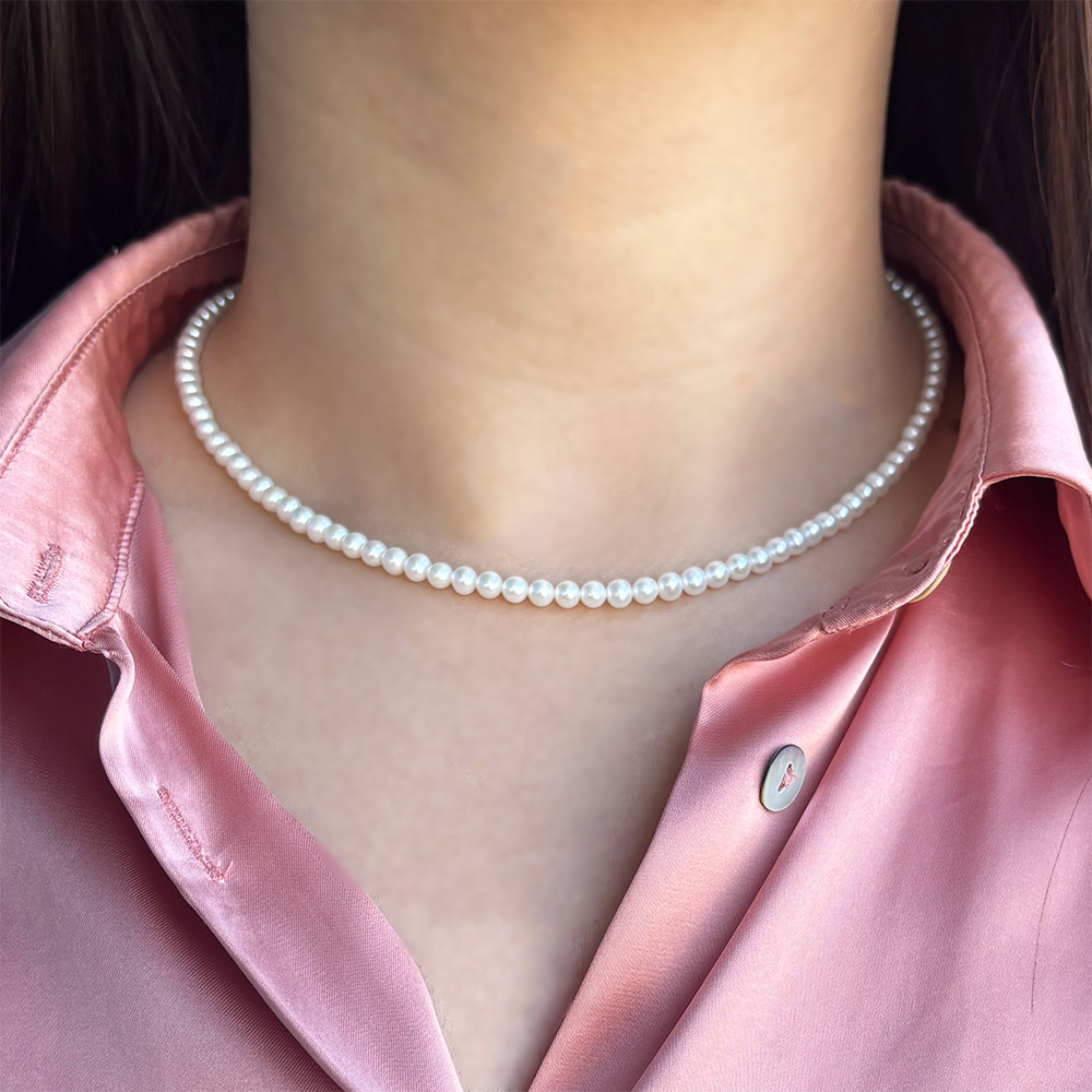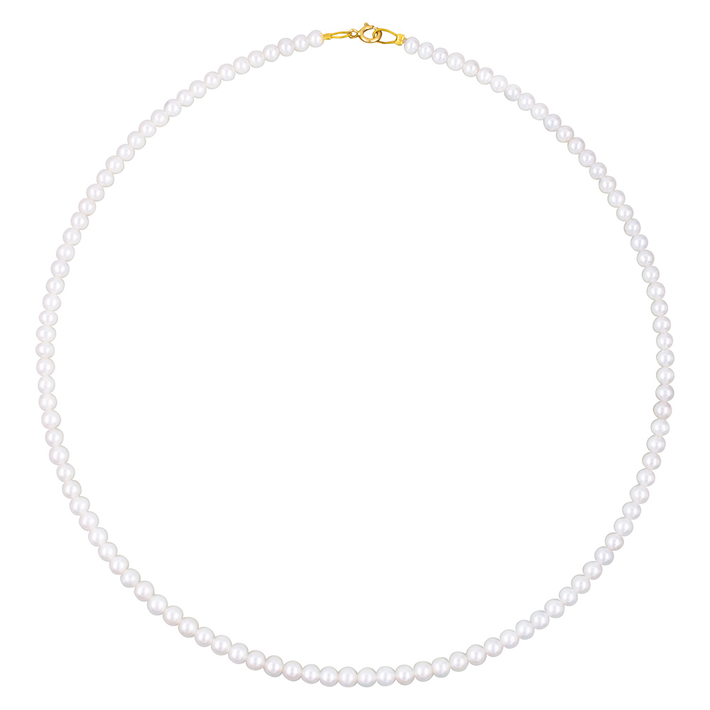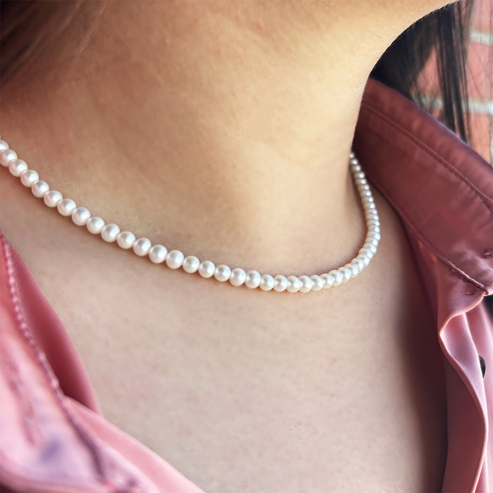• Ένα υπέροχο κολιέ με ολοστρόγγυλα λευκά μαργαριτάρια Fresh Water Pearl διαμέτρου 4,5-5 χιλιοστών, με εξαιρετική γυαλάδα.