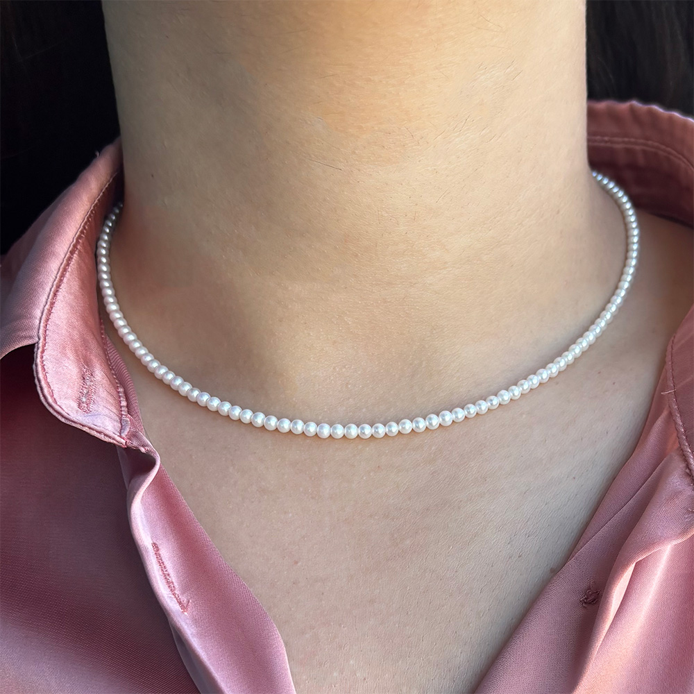• Ένα υπέροχο κολιέ με ολοστρόγγυλα μαργαριτάρια Fresh Water Pearl διαμέτρου 3-3,5 χιλιοστών, με εξαιρετική γυαλάδα.