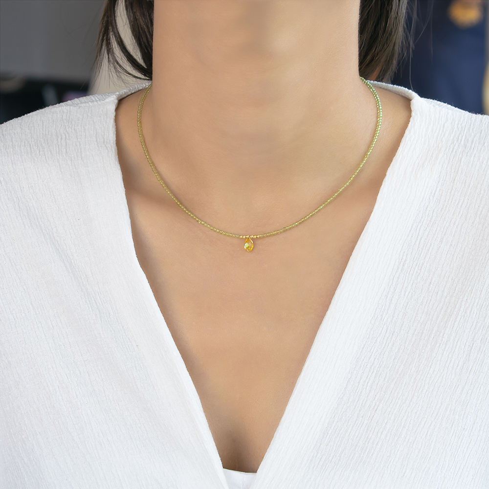 Στο κέντρο του κολιέ υπάρχει ένα εντυπωσιακό μενταγιόν με Citrine CZ σε χρυσό καστόνι 14 καρατιών διαμέτρου 5x7 χιλιοστών.