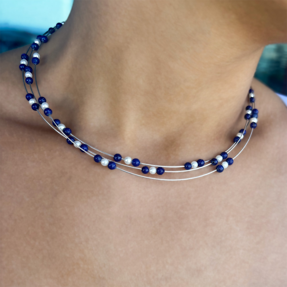 • Ένα υπέροχο 3πλο κολιέ με ημιπολύτιμο λίθο λάπις διαμέτρου 4 χιλιοστών και λευκά μαργαριτάρια Fresh Water Pearl διαμέτρου 3,5-4 χιλιοστών.