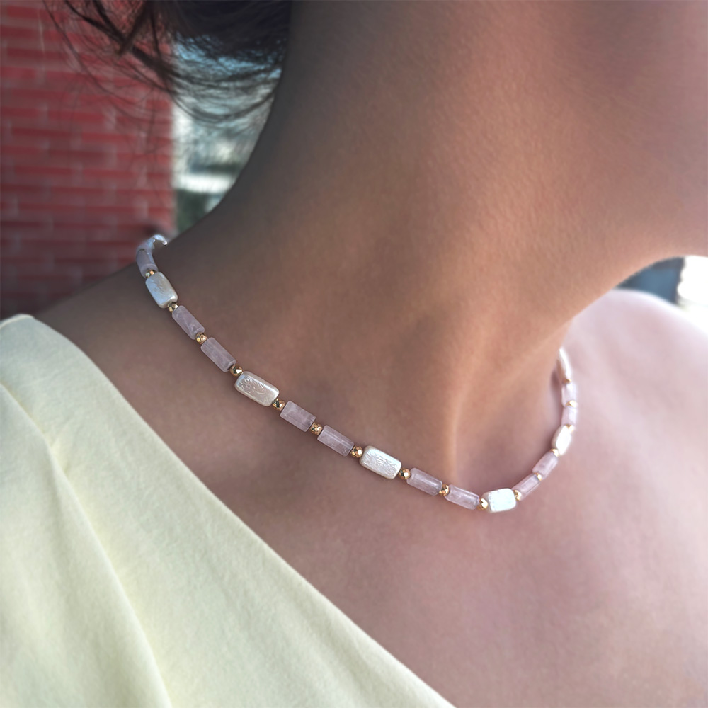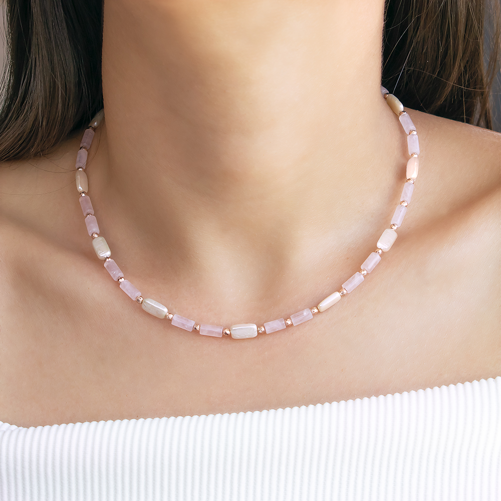 • Ένα υπέροχο κολιέ με ημιπολύτιμο λίθο Rose Quartz διαμέτρου 4 x 9 χιλιοστών σε σχήμα σωληνάκι.