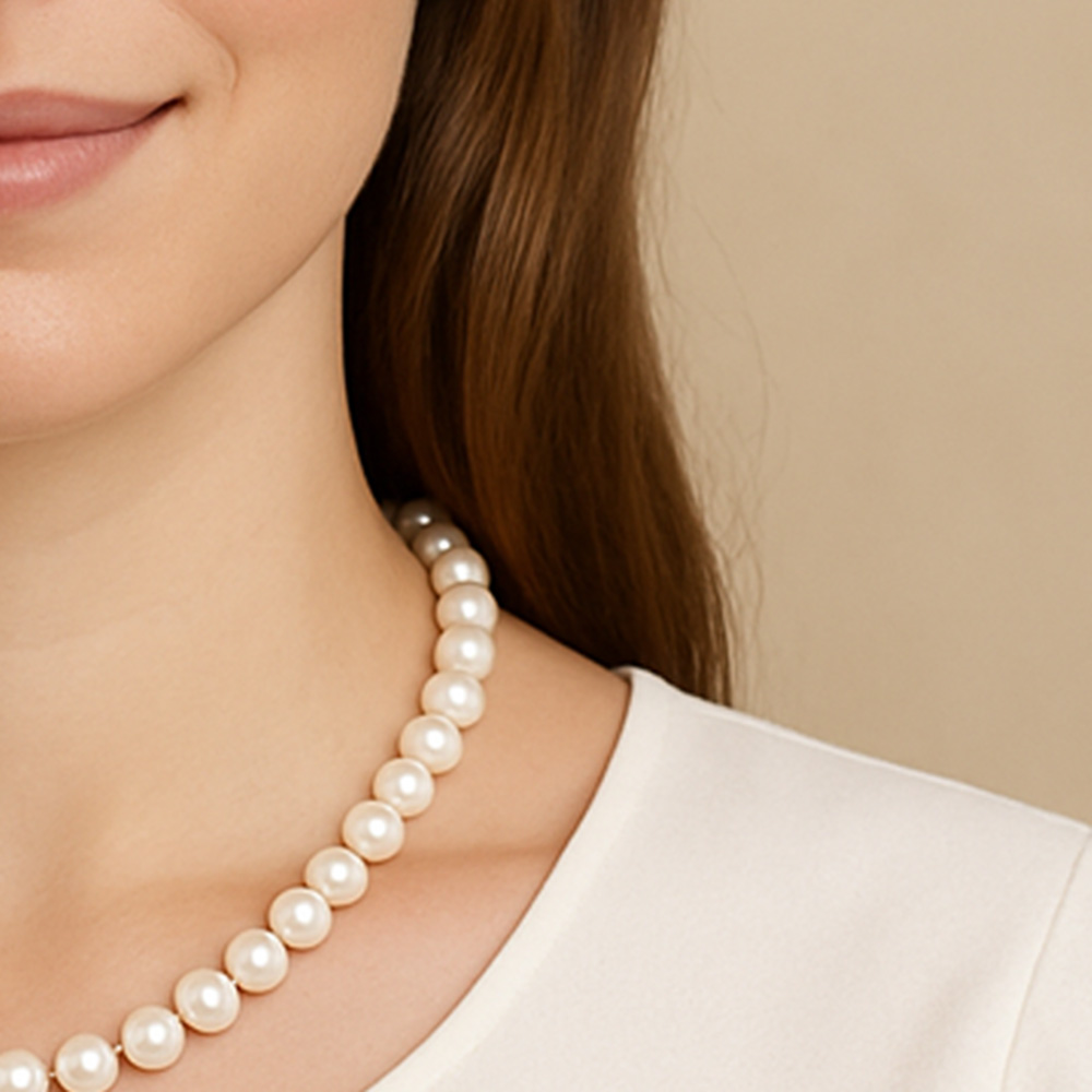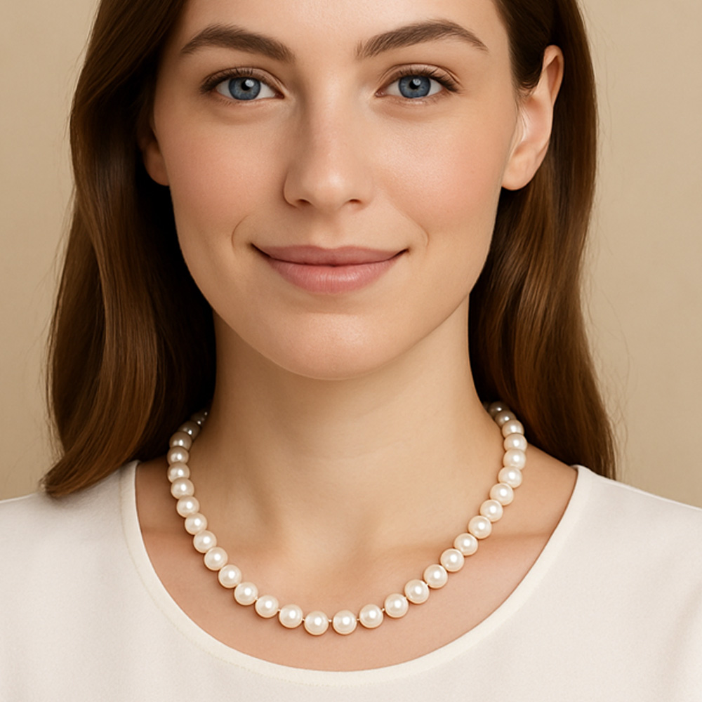 • Ένα υπέροχο κολιέ με λευκά στρόγγυλα μαργαριτάρια Fresh Water Pearl διαμέτρου 8-9 χιλιοστών.