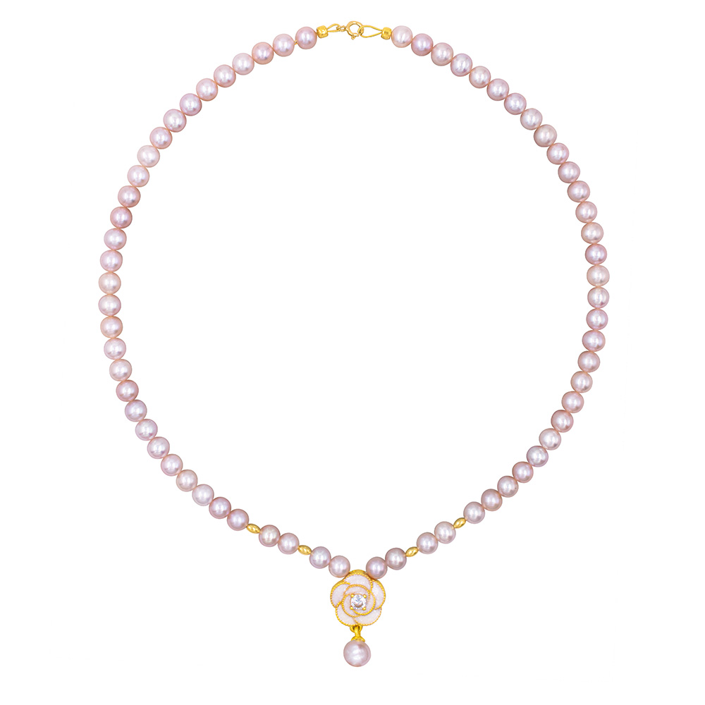 Το κολιέ εντυπωσιάζει με το σχέδιό του, καθώς στο κέντρο του υπάρχει ένα μοναδικό χειροποίητο μενταγιόν χρυσό 18 καρατίων σε σχλημα λουλούδι από Mother of Pearl διάστασης 1,5x1.5 εκατοστών διακοσμημένο με ένα λαμπερό ζιργκόν.