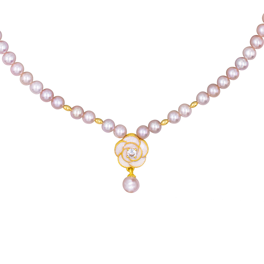Ένα κολιέ με μοντέρνα αισθητική που συνδυάζει αρμονικά το ρομαντικό χρώμα των σομόν μαργαριταριών με την αξεπέραστη λάμψη του χρυσού.