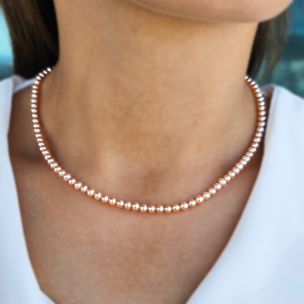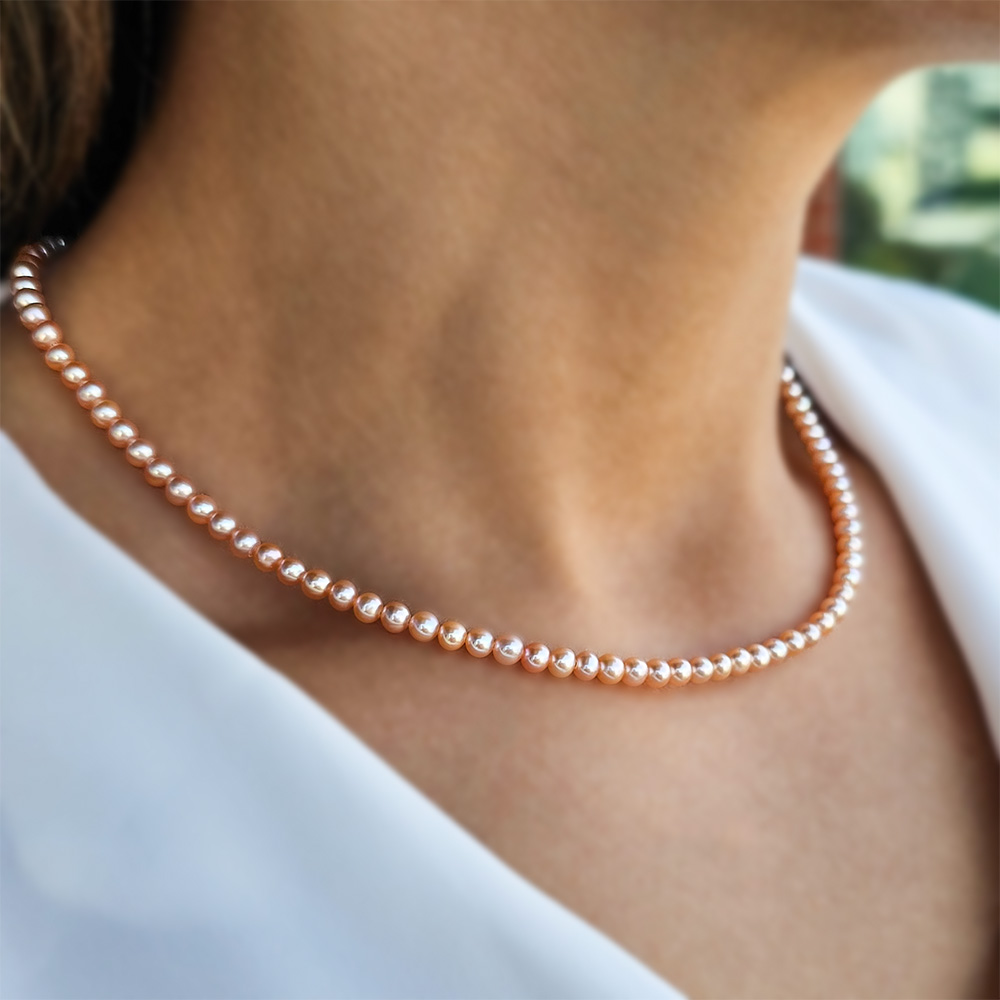 • Ένα υπέροχο κολιέ με σομόν μαργαριτάρια Fresh Water Pearl διαμέτρου 4,5 χιλιοστών.