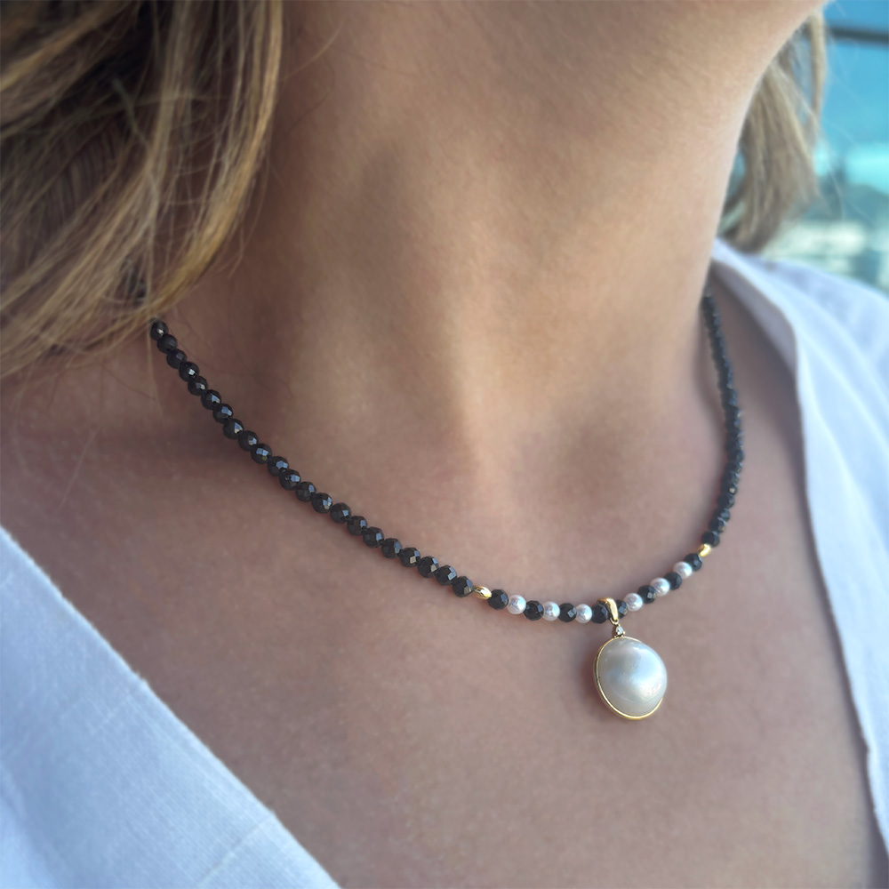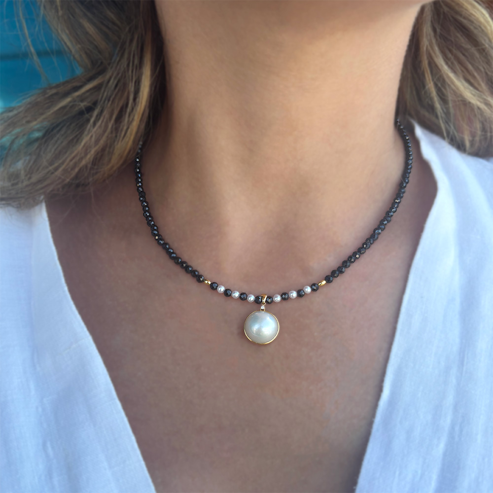 Στο κέντρο του κολιέ υπάρχει ένα χρυσό μενταγιόν 18 καρατίων διακοσμημένο με 1 διαμάντι 0,01ct και ένα εντυπωσιακό λευκό μαργαριτάρι Fresh Water Pearl διαμέτρου 12 χιλιοστών Mabe. Τα Mabe μαργαριτάρια είναι πολύ ιδιαίτερα καθώς το σχήμα τους είναι ημισφαίριο δηλαδή είναι στρόγγυλο από επάνω και από κάτω είναι πλακέ.