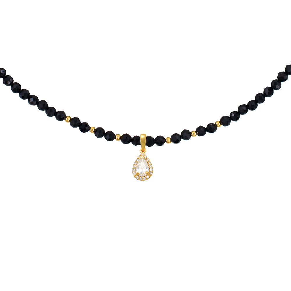 Στο κέντρο του κολιέ υπάρχει ένα εντυπωσιακό μενταγιόν χρυσό 14 καρατίων με φασεταρισμένο ημιπολύτιμο λίθο Crystal CZ διαμέτρου 6x8 χιλιοστών, σε σχήμα δάκρυ και περιμετρικά υπάρχουν 17 λαμπερά ζιργκόν.