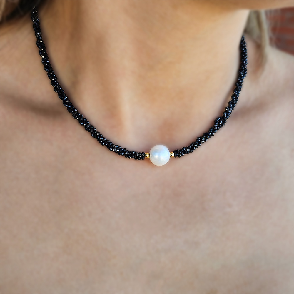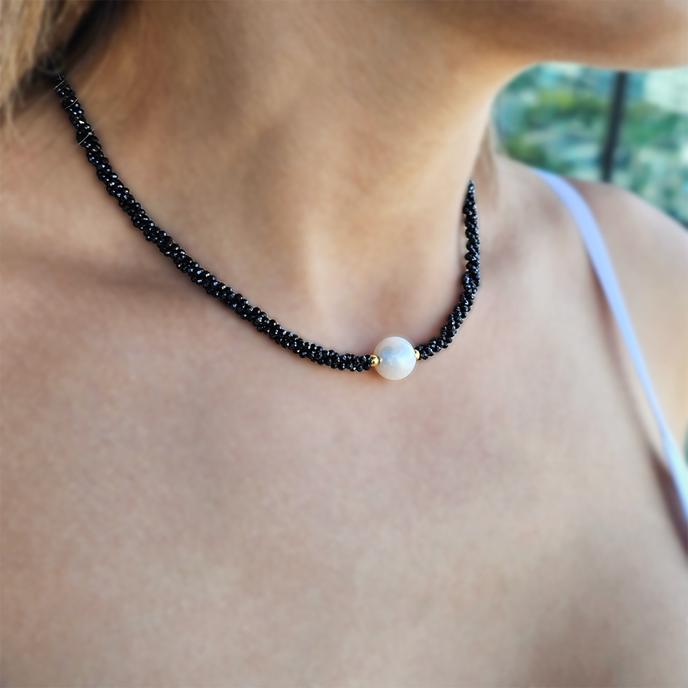 Το κολιέ εντυπωσιάζει με το σχέδιό του καθώς στο κέντρο του υπάρχει ένα στρόγγυλο λευκό μαργαριτάρι Fresh Water Pearl διαμέτρου 11 χιλιοστών.