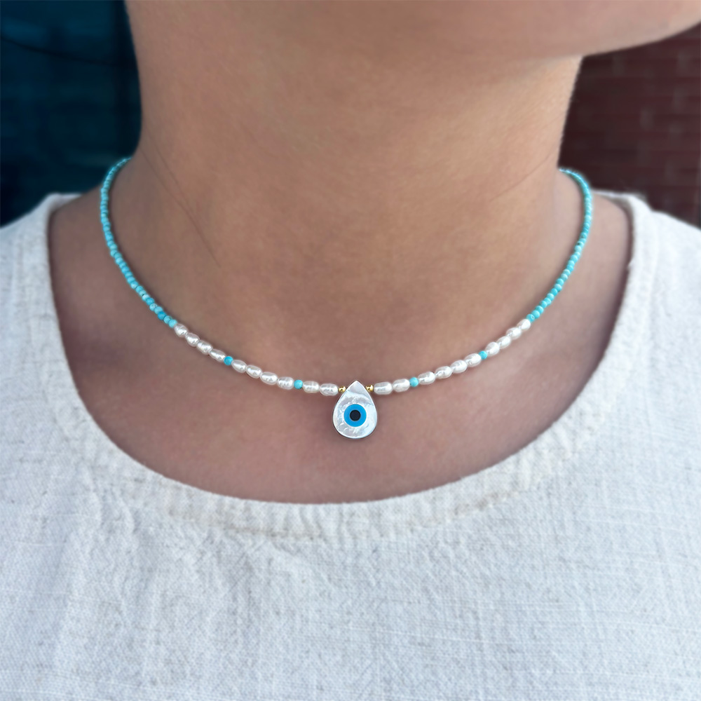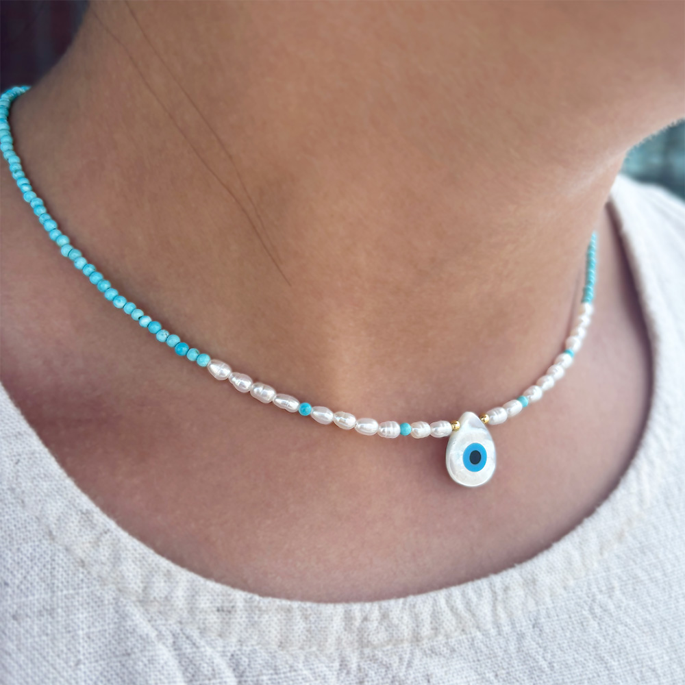Κολιέ - γούρι με Κ14 χρυσό κούμπωμα, τιρκουάζ, μαργαριτάρια και μενταγιόν μάτι - F125643D