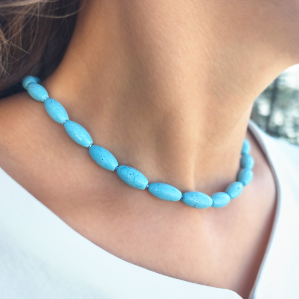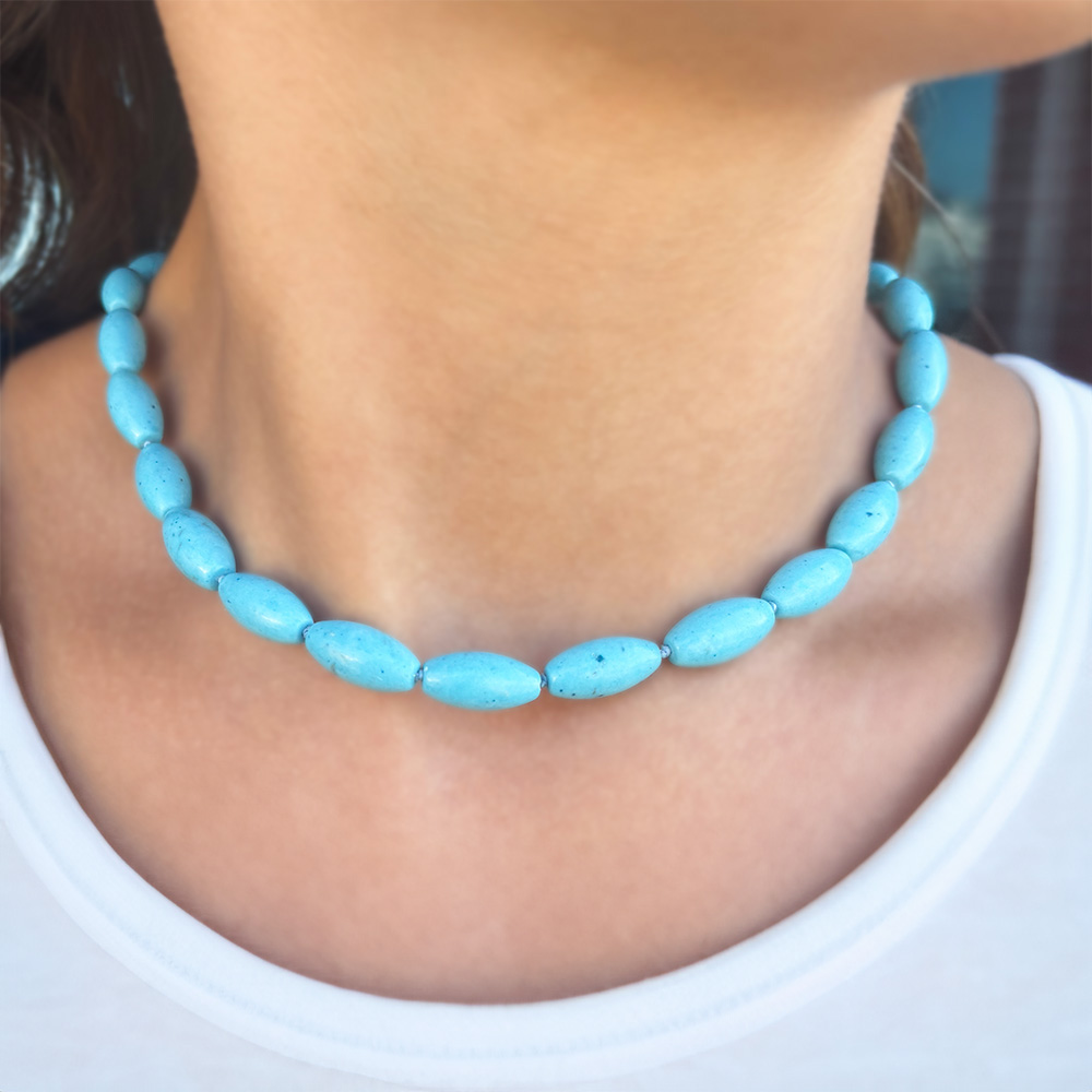 • Ένα υπέροχο κολιέ με ημιπολύτιμο λίθο τιρκουάζ διάστασης 8x16 χιλιοστών με ιδιαίτερο οβάλ σχήμα.
