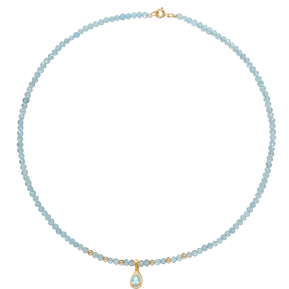 • Ένα εντυπωσιακό κολιέ με ημιπολύτιμο λίθο Αqua 3,5-4 χιλιοστών και χρυσό κούμπωμα 14 καρατιών.
