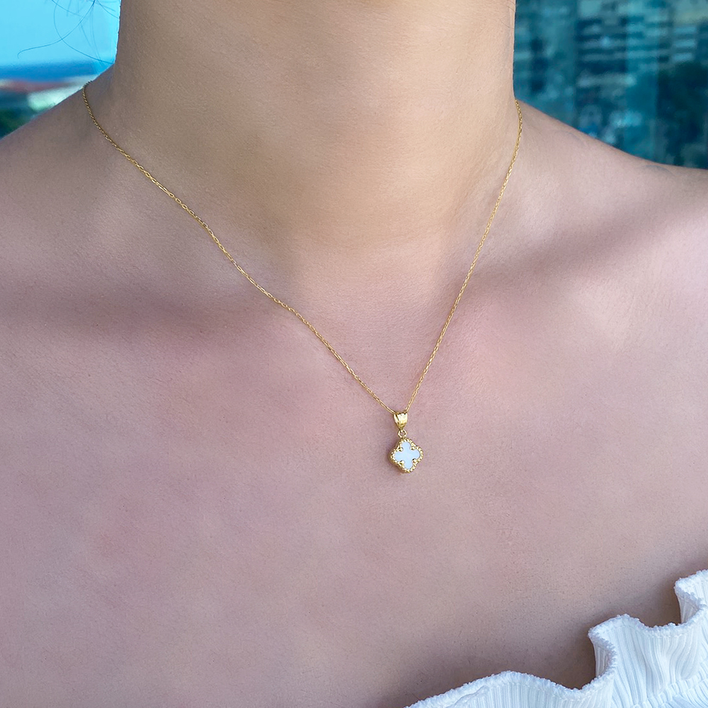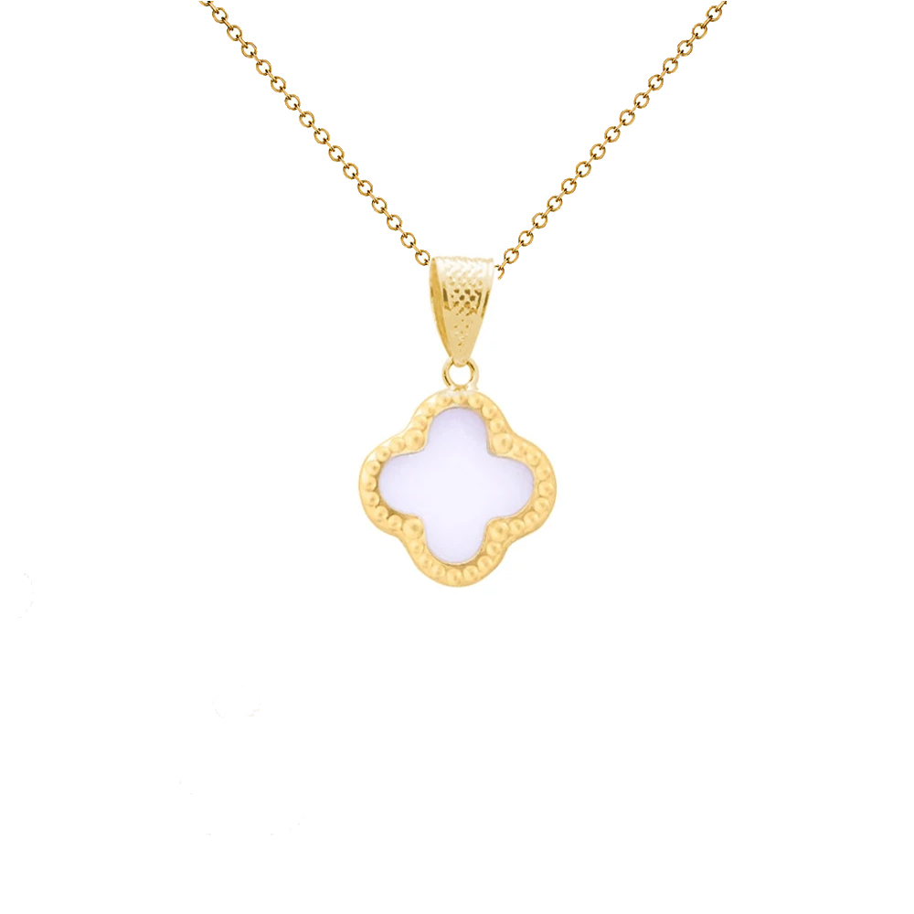 • Ένα υπέροχο κολιέ με χρυσή αλυσίδα και μενταγιόν 14 καρατιών με Mother of Pearl σε χαρακτηριστικό σχήμα λουλούδι - σταυρός, διαμέτρου 9x15 χιλιοστών.