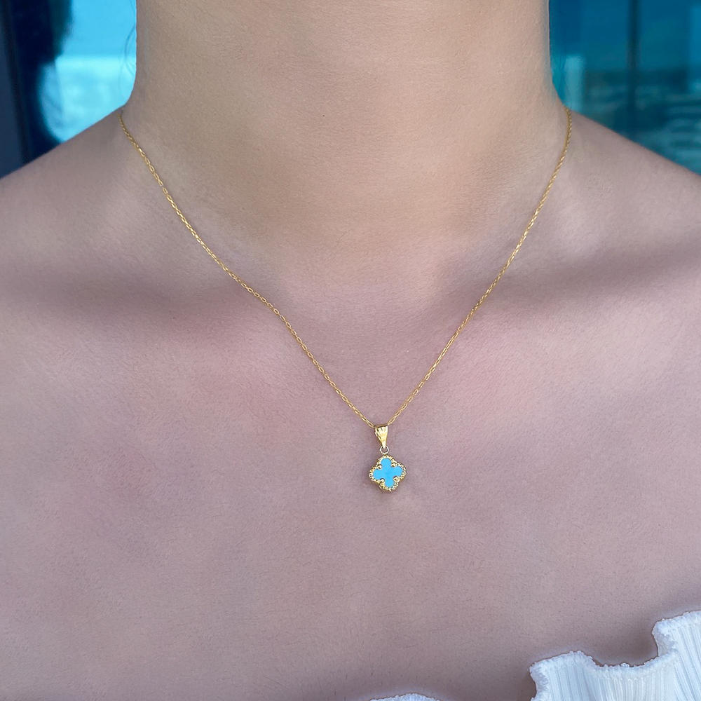 • Ένα υπέροχο κολιέ με χρυσή αλυσίδα και μενταγιόν 14 καρατιών με τιρκουάζ σε χαρακτηριστικό σχήμα λουλούδι - σταυρός, διάστασης 9x15 χιλιοστών.