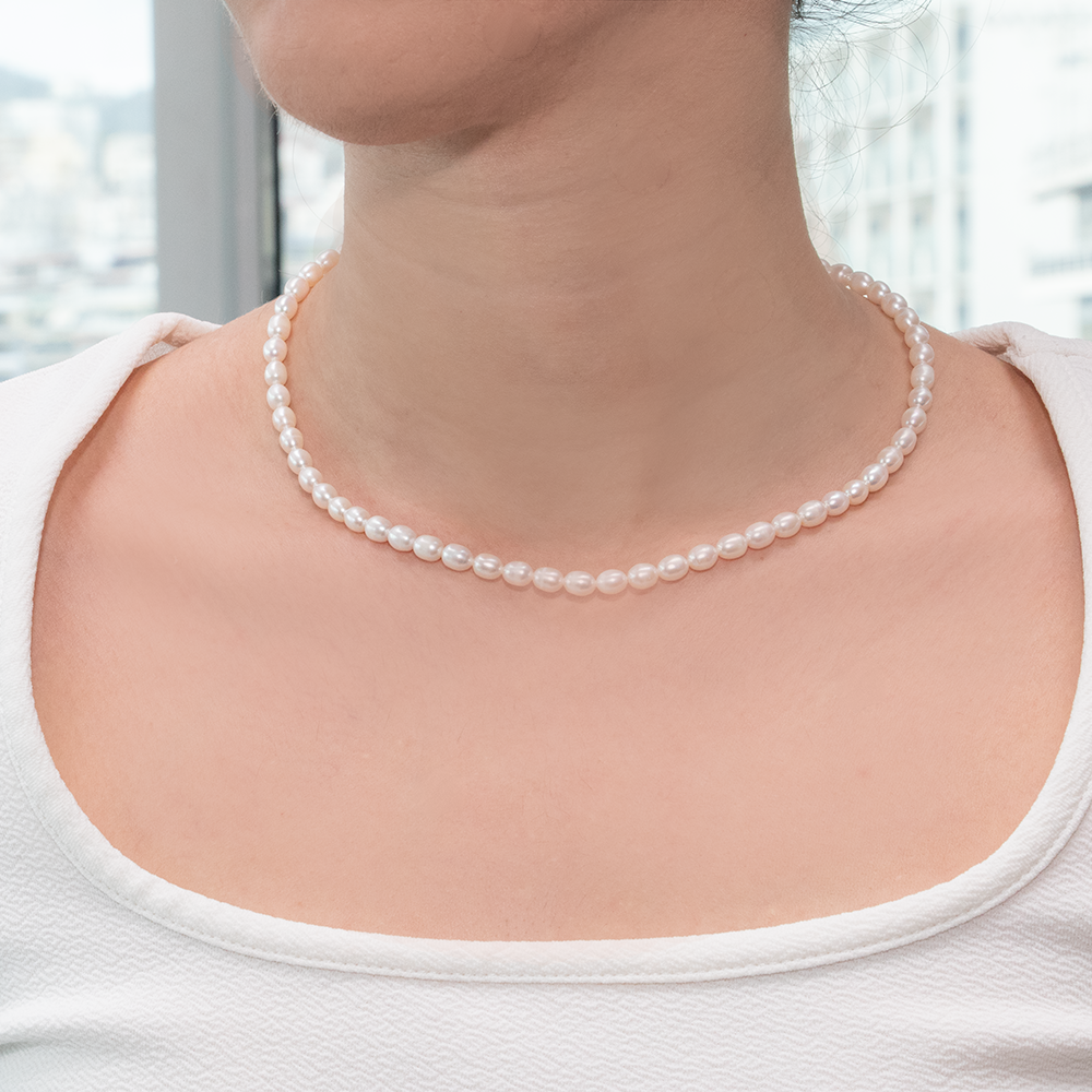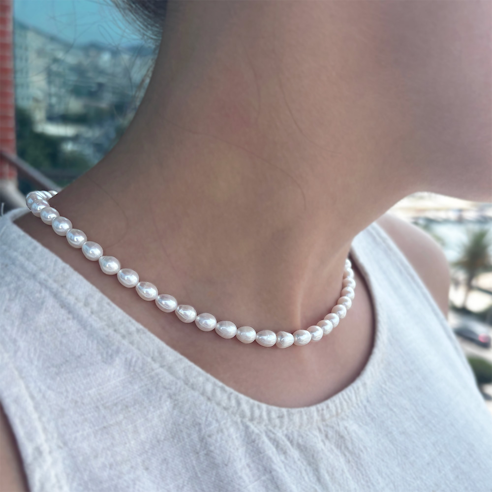 • Ένα υπέροχο κολιέ με λευκά μαργαριτάρια γλυκού νερού Fresh Water Pearl διαμέτρου 6 x 7 χιλιοστών σχήματος Long.