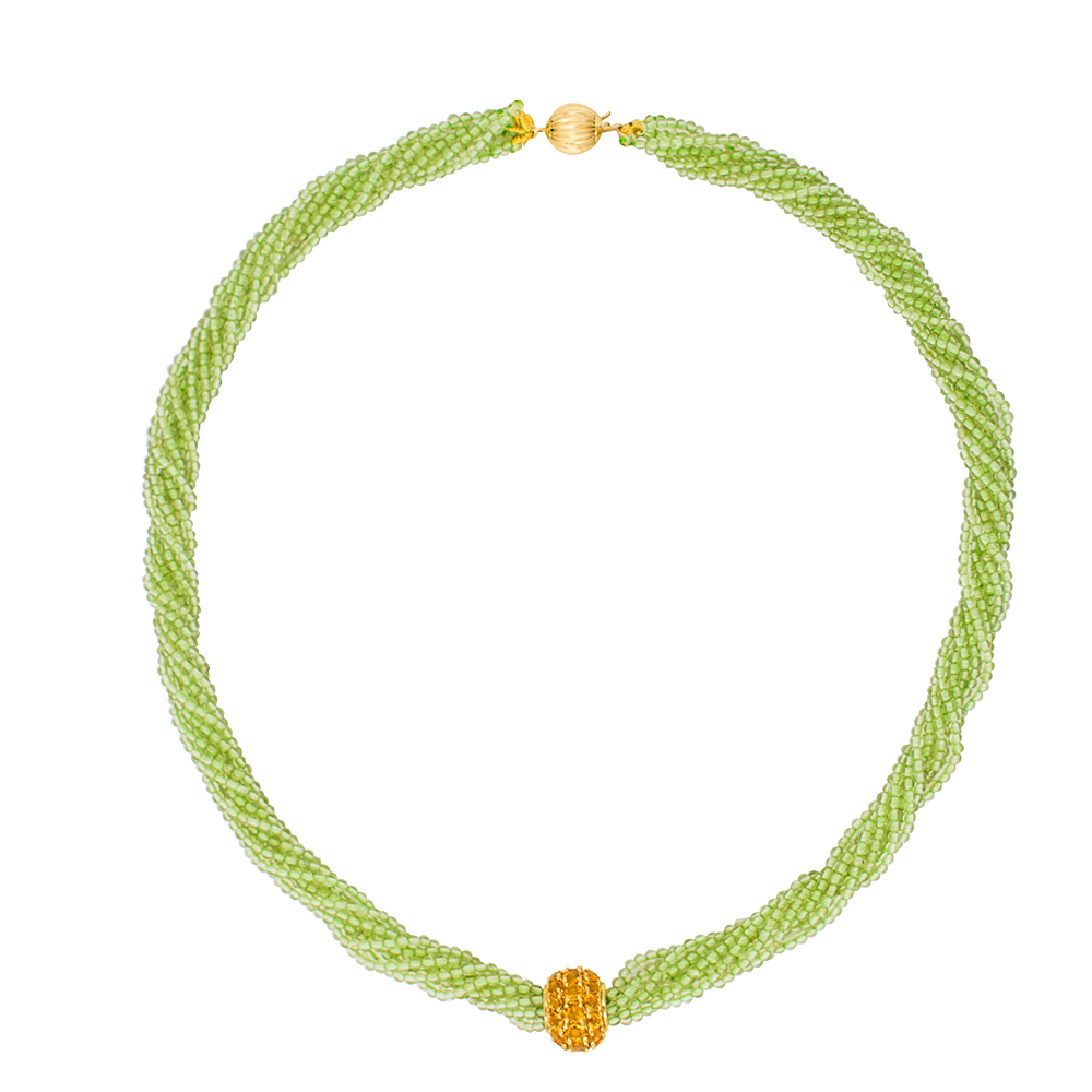 • Ένα υπέροχο κολιέ με 9 σειρές ημιπολύτιμους λίθους Peridot διαμέτρου 2,5 χιλιοστών.