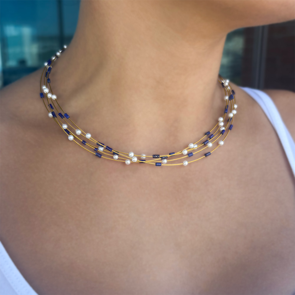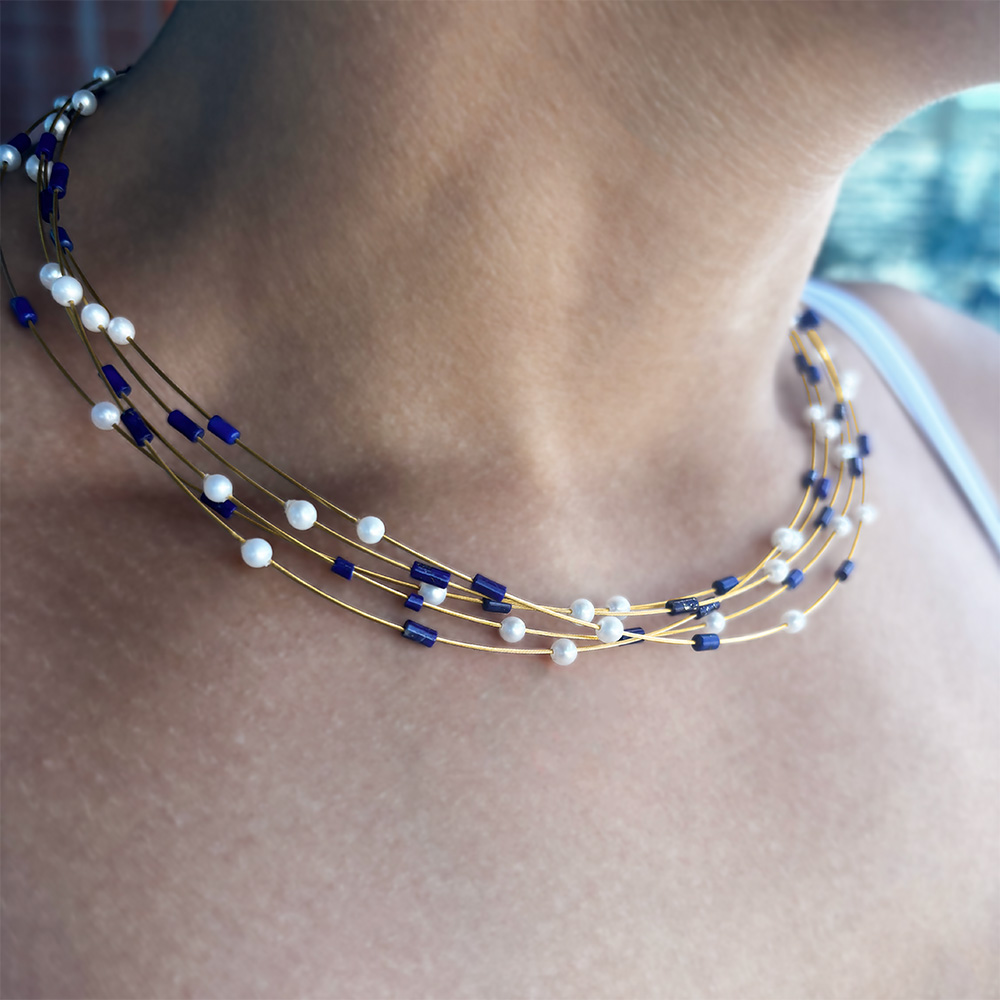 • Ένα υπέροχο 5πλο κολιέ με λευκά μαργαριτάρια Fresh Water Pearl διαμέτρου 3-3,5 χιλιοστών και ημιπολύτιμο λίθο lapis διαμέτρου 2,5x4,5 χιλιοστών σε σχήμα σωληνάκι.
