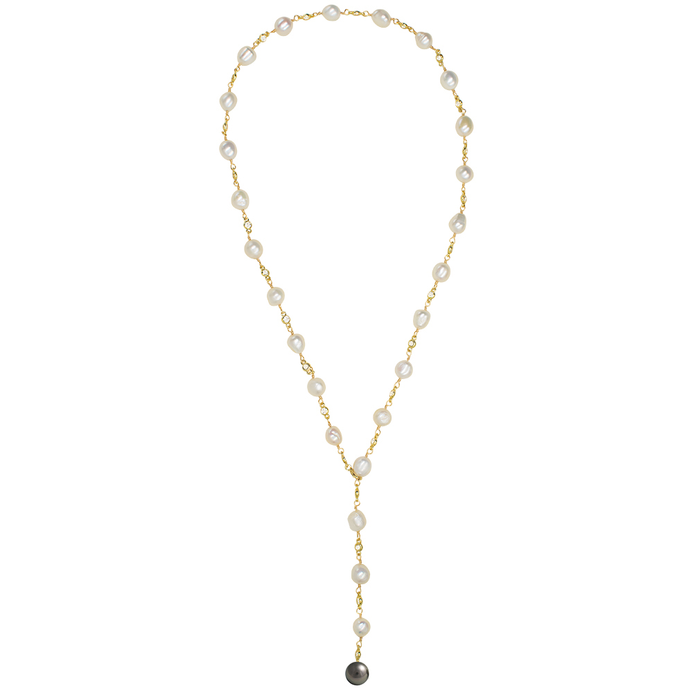 • Ένα υπέροχο κολιέ - ροζάριο με μεγάλα λευκά μαργαριτάρια Fresh Water Pearl διαμέτρου 8 x 11 χιλιοστών, σε αλυσίδα από επιχρυσωμένο μέταλλο.