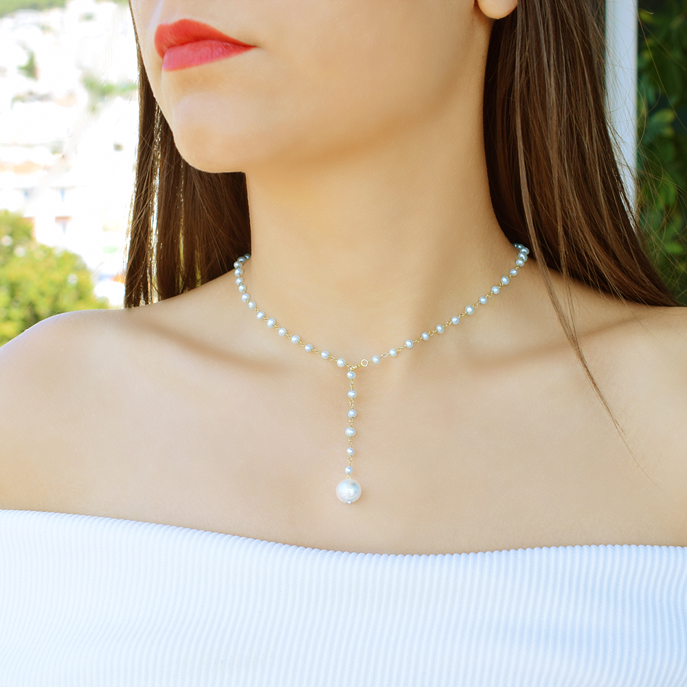 Κολιέ - ροζάριο με λευκά μαργαριτάρια σε ασημένια αλυσίδα- S121753