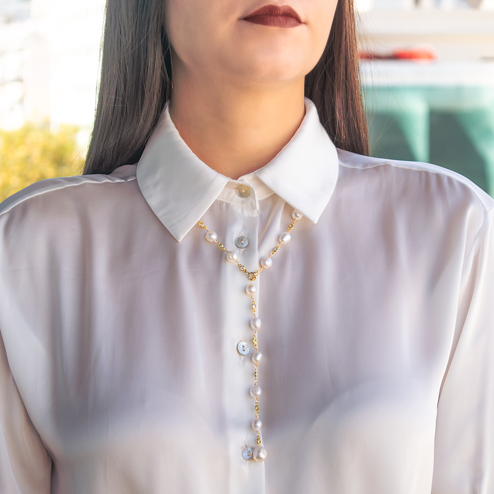 Το κολιέ εντυπωσιάζει με το σχέδιό του, καθώς το κούμπωμα κλείνει σε όποιο σημείο της αλυσίδας επιθυμείτε έτσι ώστε να μπορείτε να το προσαρμόζετε στο μήκος που σας αρέσει και να φορεθεί σαν γραβάτα ή κρεμαστό μοτίφ ή ένα πολύ μεγάλο κολιέ.