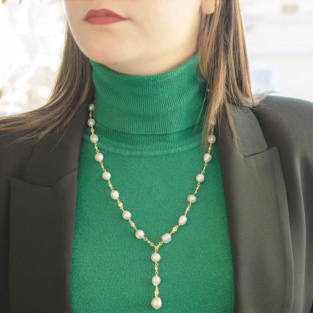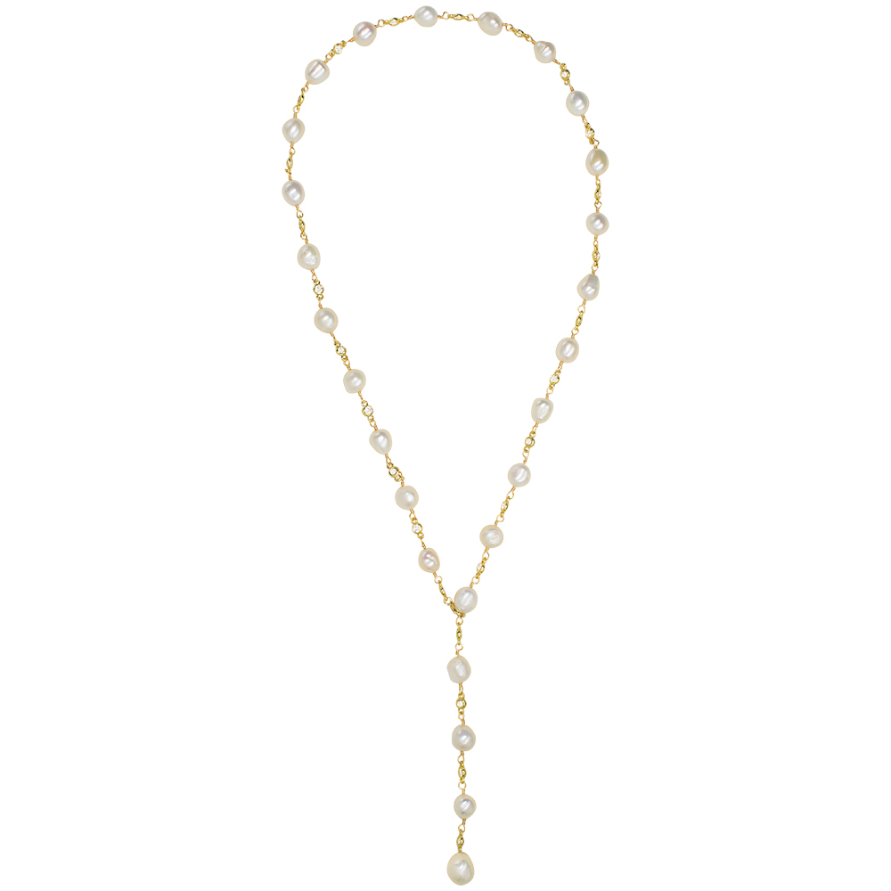 • Ένα υπέροχο κολιέ - ροζάριο με μεγάλα λευκά μαργαριτάρια Fresh Water Pearl διαμέτρου 8,5 x 11 χιλιοστών, σε αλυσίδα από επιχρυσωμένο μέταλλο.