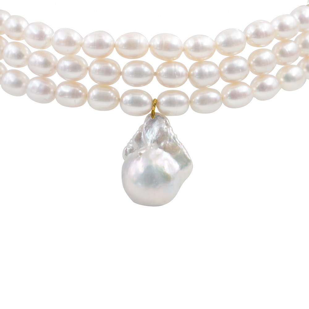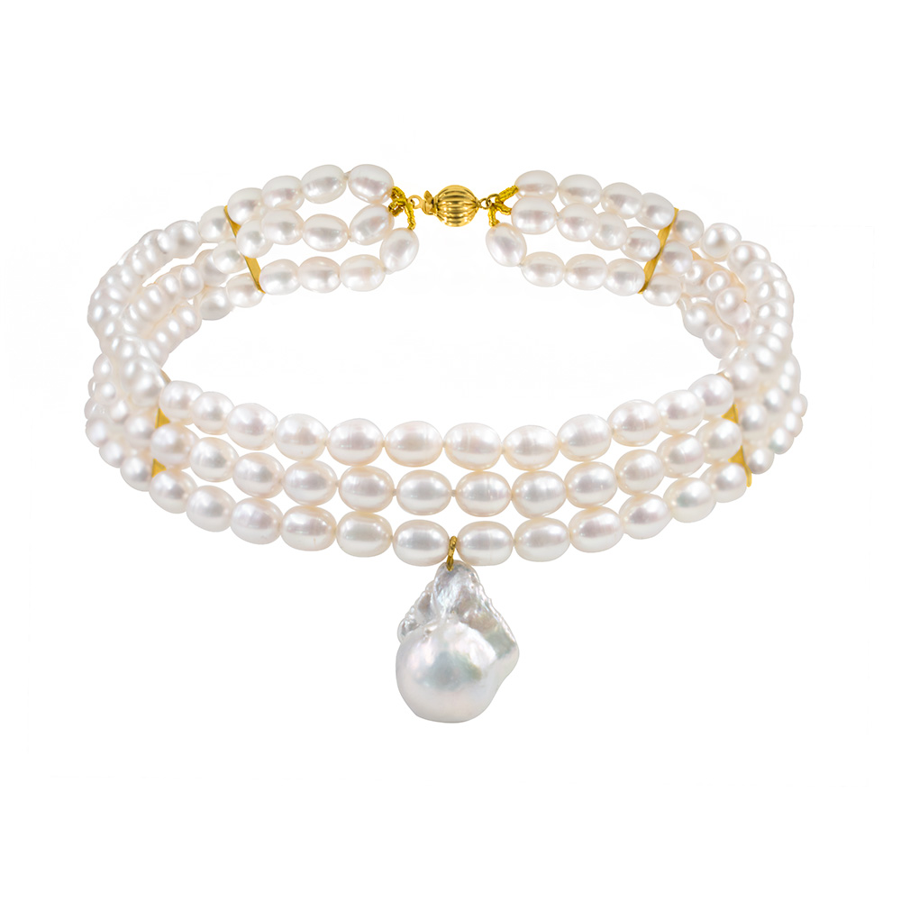 Κολιέ choker με Κ14 χρυσό κούμπωμα, 3 σειρές μαργαριτάρια και μενταγιόν με μαργαριτάρι Baroque - F126488
