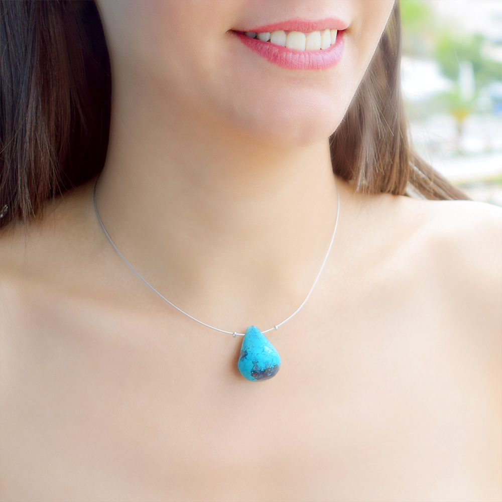 • Ένα ξεχωριστό λευκόχρυσο Κ18 κολιέ με εντυπωσιακή Τιρκουάζ σταγόνα σε σχήμα Drop διαμέτρου 20 x 30mm ενδιάμεσα σε 2 ροδέλες 18 καρατίων.