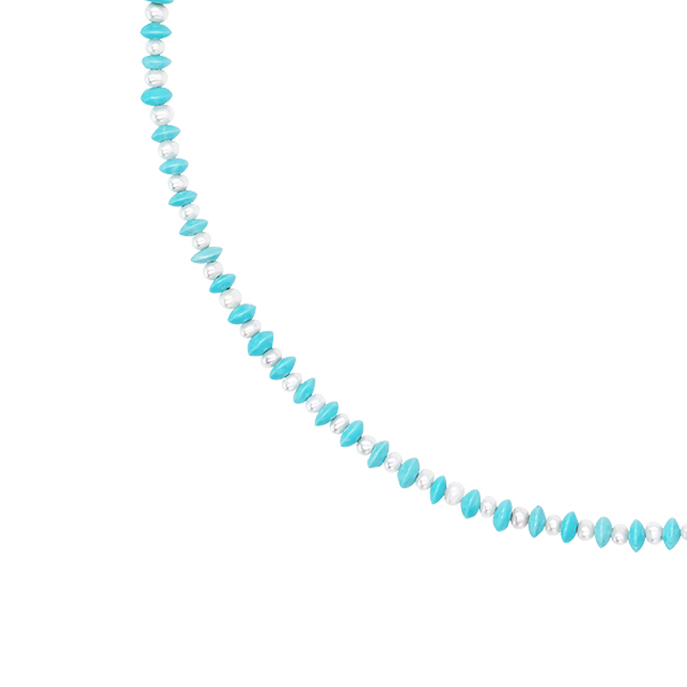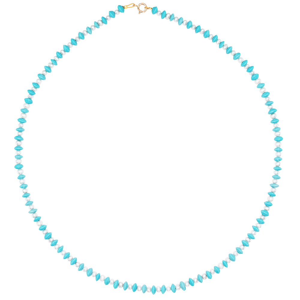 • Ένα υπέροχο κολιέ με 86 ημιπολύτιμους λίθους τιρκουάζ διαμέτρου 2x5 χιλιοστών, σε σχήμα δίσκου, με 85 λευκά μαργαριτάρια Fresh Water Pearl 2-3 χιλιοστών.