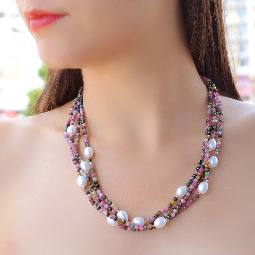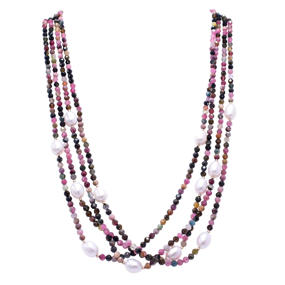 • Ένα υπέροχο χρυσό Κ14 κολιέ με 4 σειρές φασεταρισμένους πολύχρωμους ημιπολύτιμους λίθους τουρμαλίνης διαμέτρου 4 χιλιοστών και 12 εντυπωσιακά μαργαριτάρια γλυκού νερού Fresh Water Pearl  διαμέτρου 8,5x11 χιλιοστών.