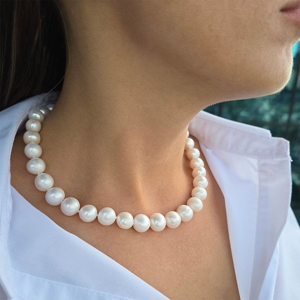 Ένα κολιέ με ιδιαίτερα προσιτή τιμή για τόσο μεγάλο μέγεθος μαργαριταριών.