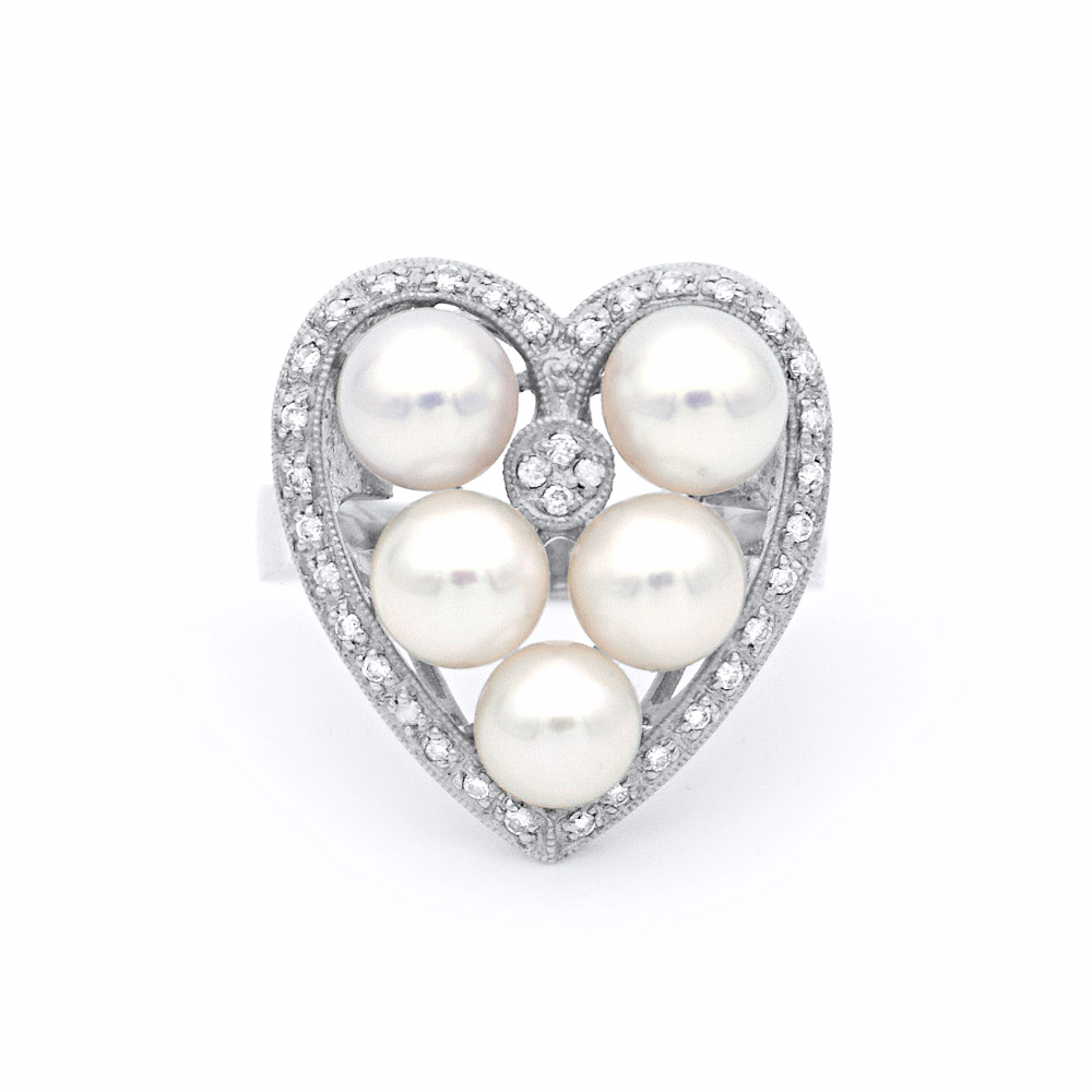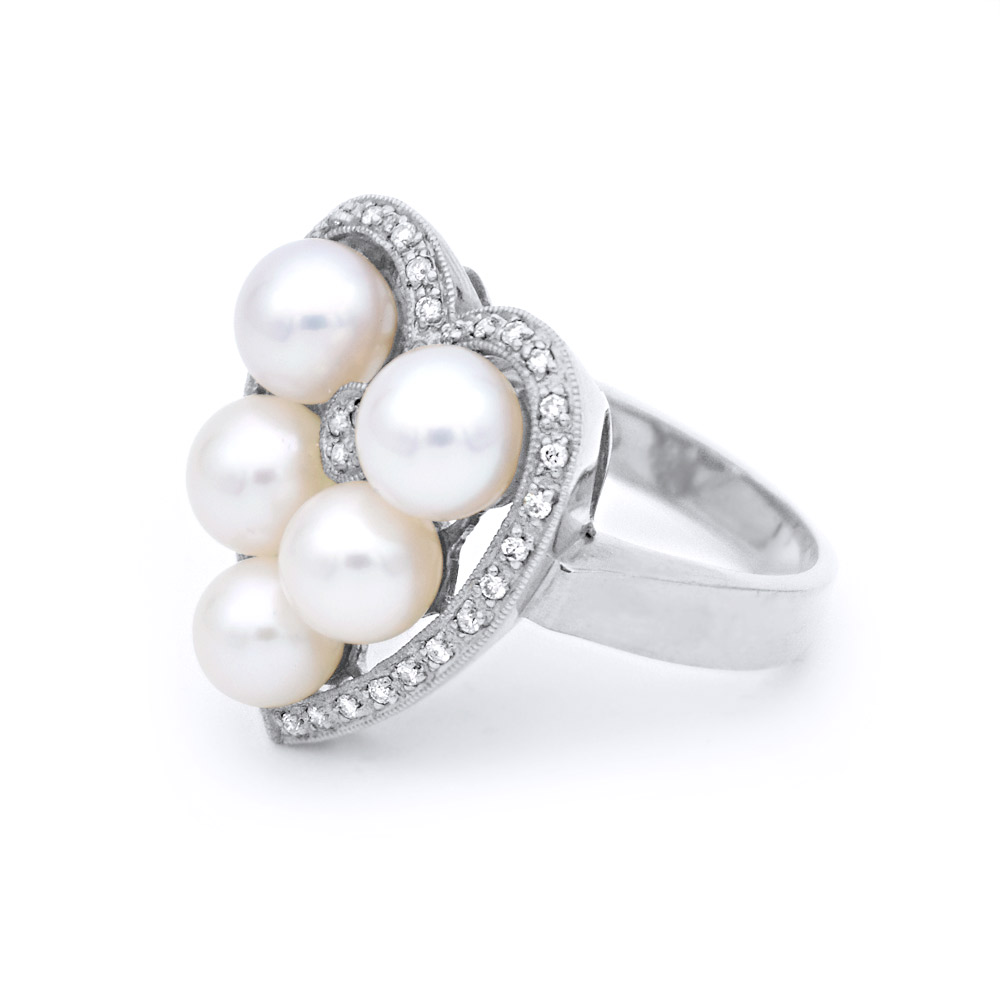 • Ένα μοναδικό δαχτυλίδι με 5 λευκά μαργαριτάρια QTV Akoya Pearl, άριστης ποιότητας 6,0 - 7,0 χιλιοστών.
