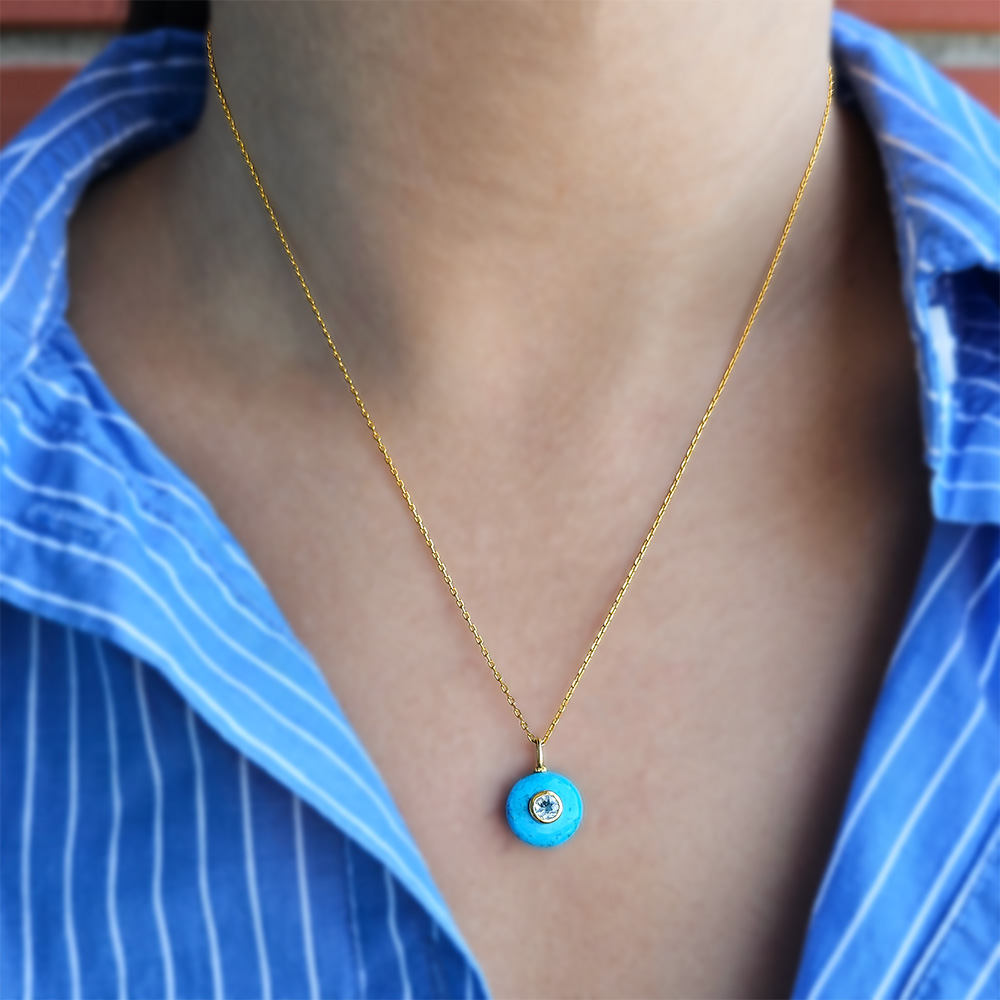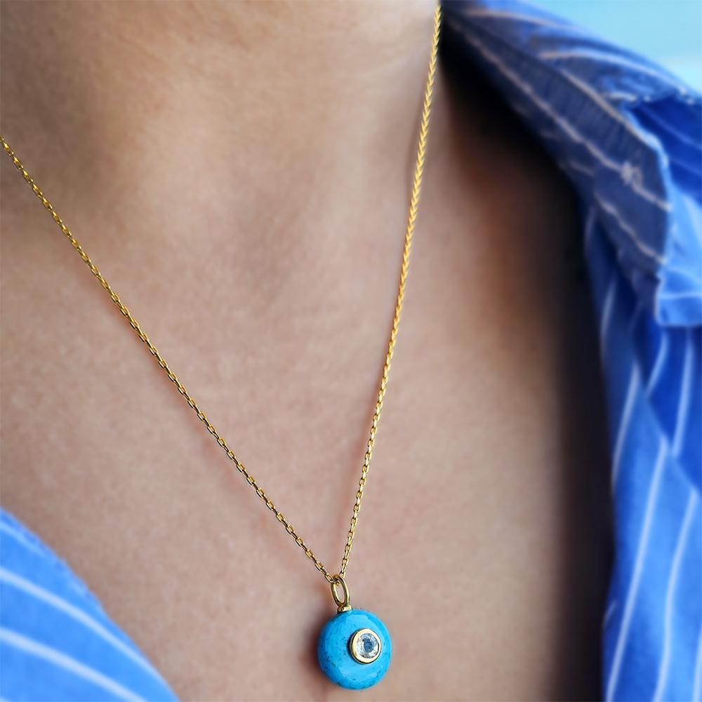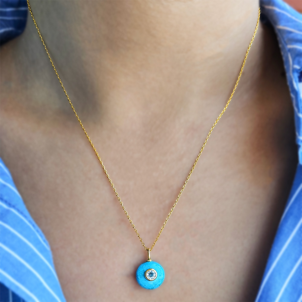 • Ένα υπέροχο μενταγιόν με ημιπολύτιμο λίθο turquoise διαμέτρου 12,5 χιλιοστών.