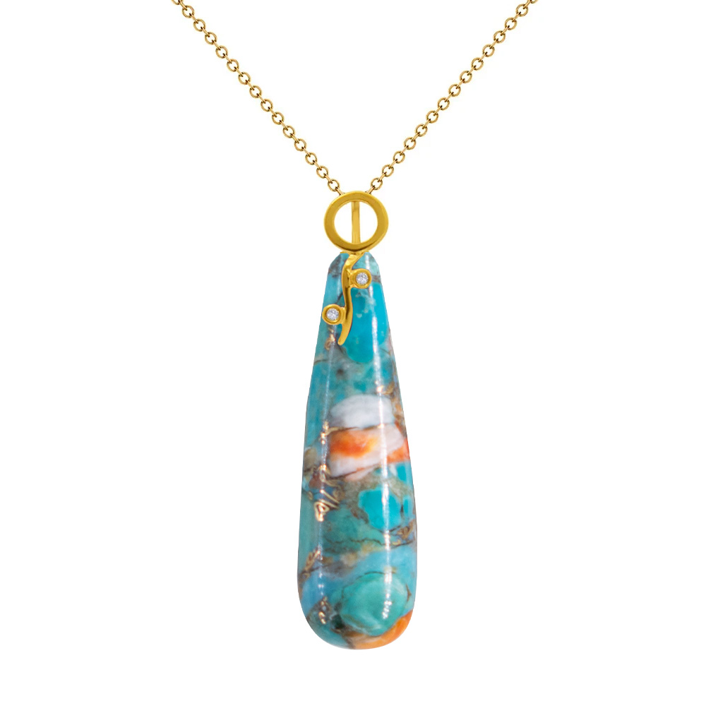 • Ένα υπέροχο μενταγιόν με ημιπολύτιμο λίθο Spiny Oyster διάστασης 8x30 χιλιοστών σε σχήμα σταγόνας και αποχρώσεις του γαλάζιου και του πορτοκαλί.