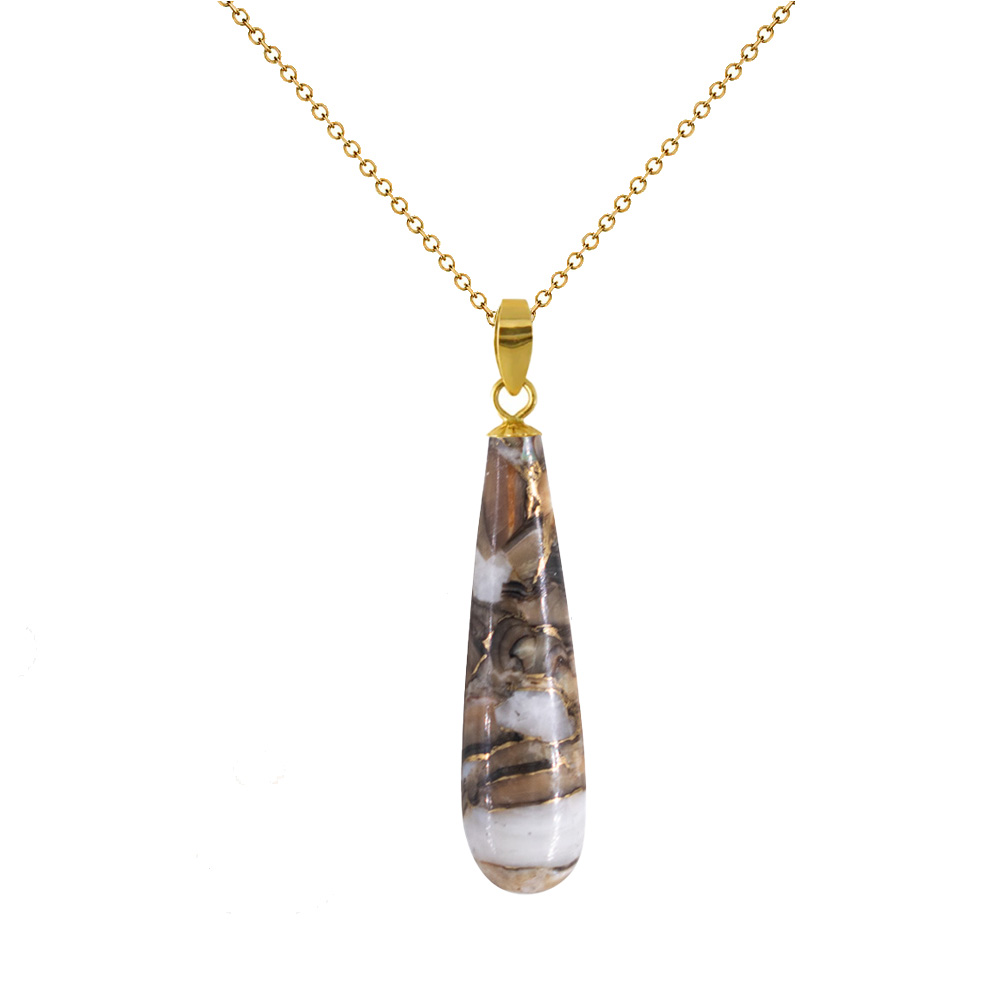 • Ένα υπέροχο μενταγιόν με ημιπολύτιμο λίθο Spiny Oyster διάστασης 8x30 χιλιοστών σε σχήμα σταγόνας και γήινες αποχρώσεις.