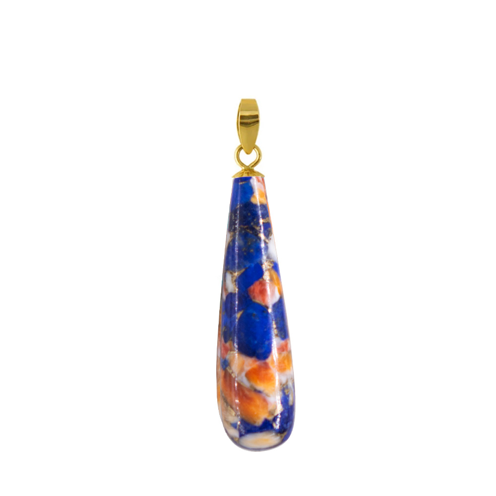 • Ένα υπέροχο μενταγιόν με ημιπολύτιμο λίθο Spiny Oyster διάστασης 8x30 χιλιοστών σε σχήμα σταγόνας και αποχρώσεις του μπλε και του πορτοκαλί.