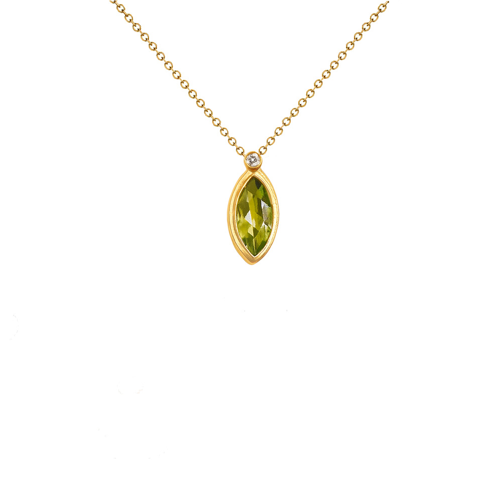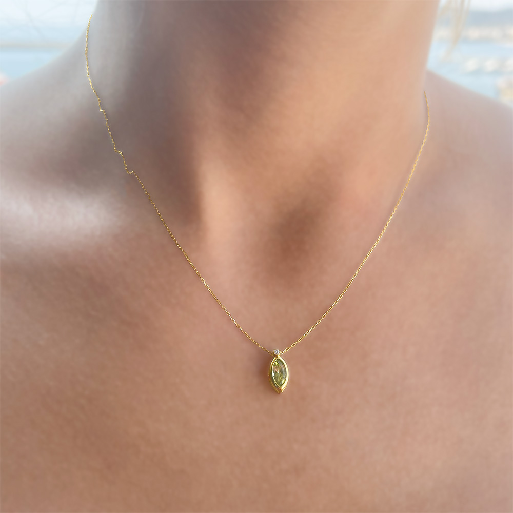 Ένα ευκολοφόρετο μενταγιόν που συνδυάζει το γλυκό πράσινο του περίδοτου με τον χρυσό και διαμάντι.