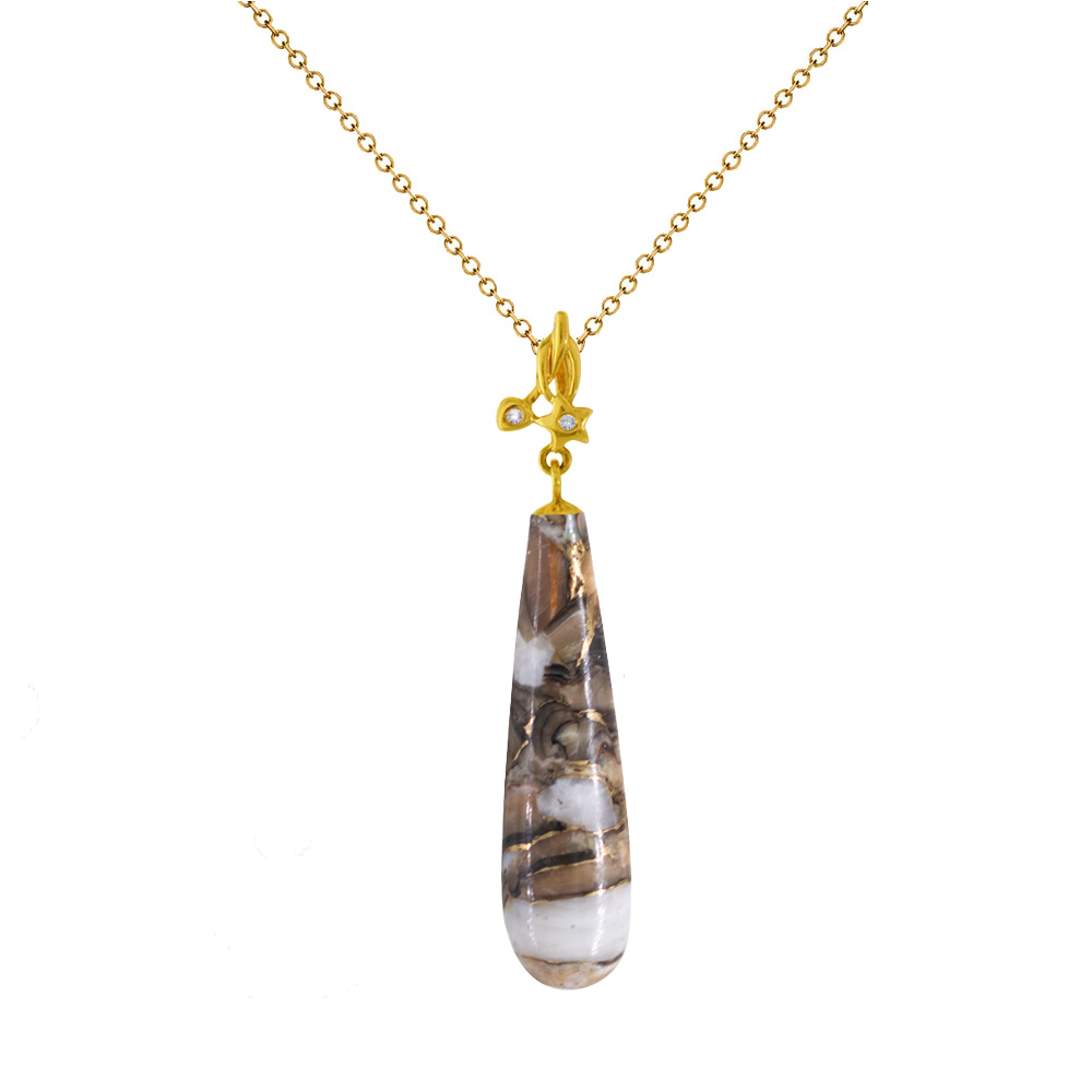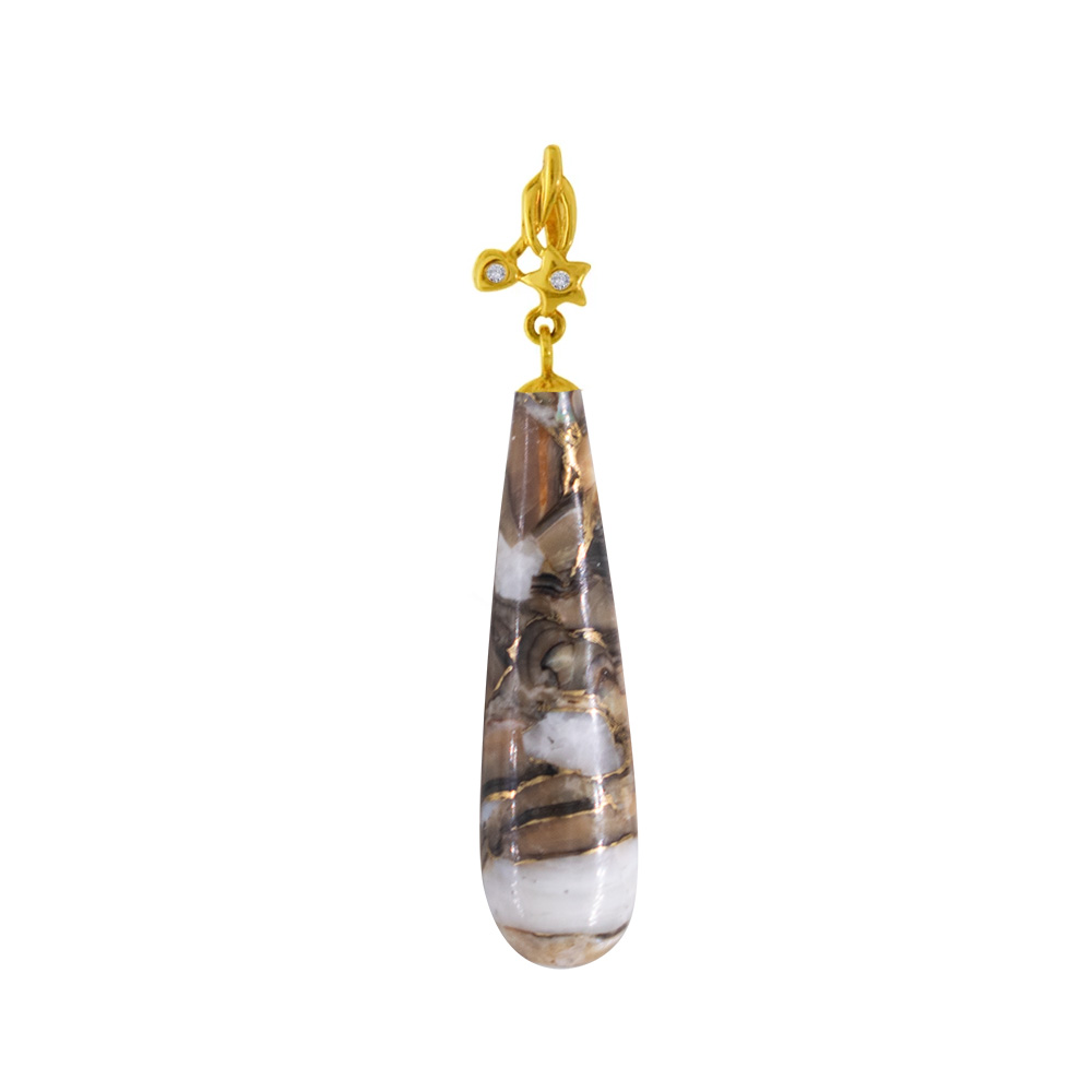 • Ένα υπέροχο μενταγιόν με ημιπολύτιμο λίθο Spiny Oyster διάστασης 8x30 χιλιοστών σε σχήμα σταγόνας και γήινες αποχρώσεις.