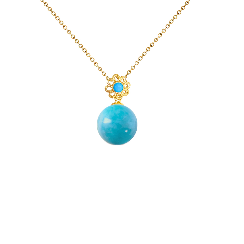 • Ένα μοναδικό μενταγιόν με ημιπολύτιμο λίθο Τιρκουάζ, λείας κοπής, διαμέτρου 10 χιλιοστών σε σχήμα Round (στρόγγυλο).