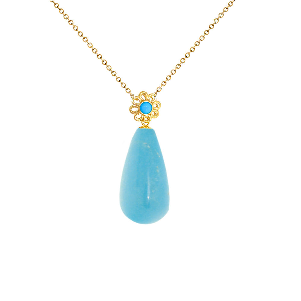 • Ένα εντυπωσιακό μενταγιόν με ημιπολύτιμο λίθο Τιρκουάζ σε σχήμα Drop (σταγόνα), με διάσταση 8 x 20 χιλιοστών.