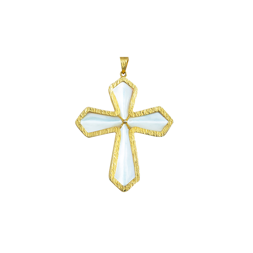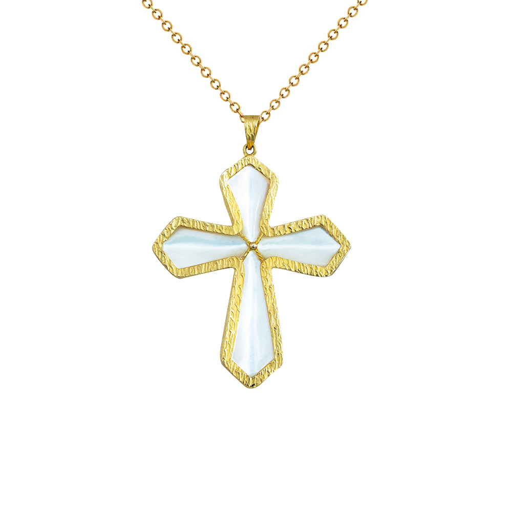 • Ένα υπέροχο μενταγιόν με ένα μοναδικό χρυσό σταυρό 14 καρατιών με Shell στο εσωτερικό του.