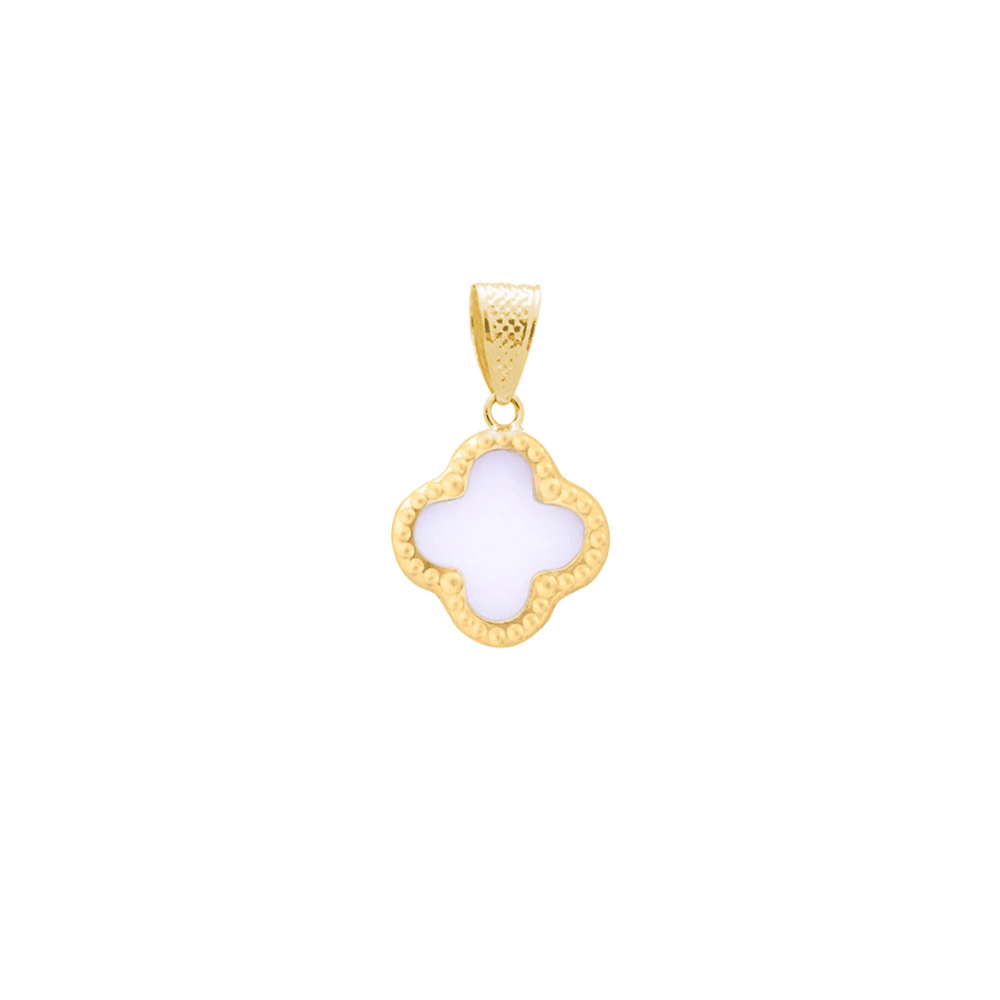 • Ένα ιδιαίτερο μενταγιόν διαμέτρου 9x15 χιλιοστών, με ένα πανέμορφο Mother of Pearl άριστης ποιότητας με χαρακτηριστικό σχήμα λουλούδι - σταυρός και χρυσή βάση 14 καρατιών.