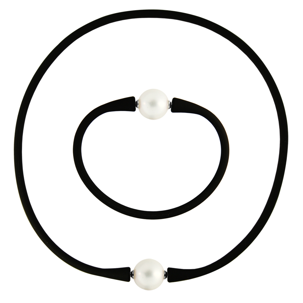 Σετ κολιέ και βραχιόλι με λευκά μαργαριτάρια και Black Elastic Silicon - M990044