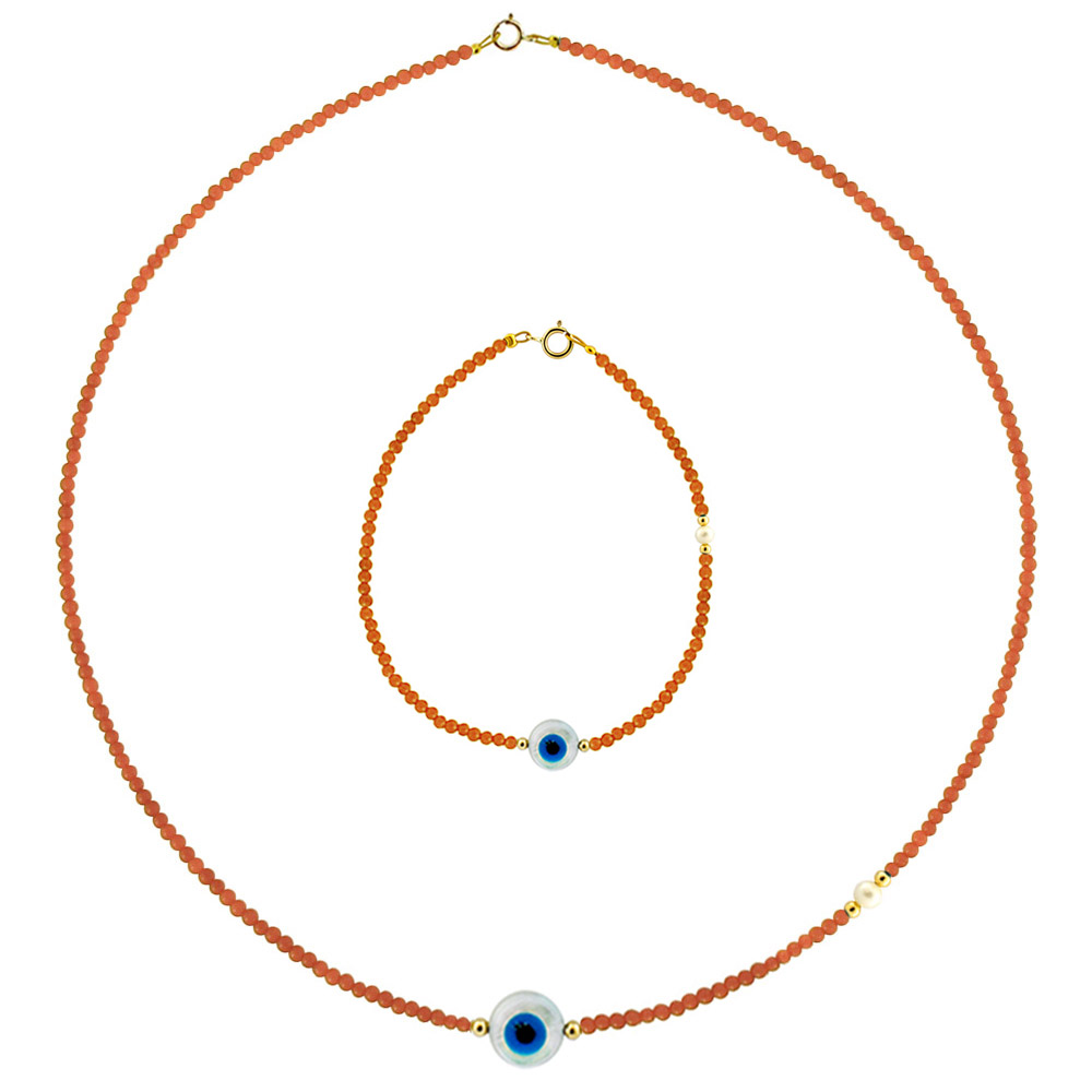 2. Ένα υπέροχο βραχιόλι με ανοιχτόχρωμα κοράλλια διαμέτρου 2-3 χιλιοστών. Στο κέντρο του υπάρχει ένα ματάκι δημιουργημένο από το εσωτερικό τμήμα του μαργαριτοφόρου οστράκου Shell Pearl, ανάμεσα σε 2 χρυσά στοιχεία 14 καρατίων. Δεξιά από το ματάκι υπάρχει ένα μαργαριτάρι Fresh Water Pearl διαμέτρου 3,5 χιλιοστά ανάμεσα σε 2 χρυσά στοιχεία 14 καρατίων. Διαθέτει επίσης χρυσό κούμπωμα ασφαλείας 14 καρατίων.