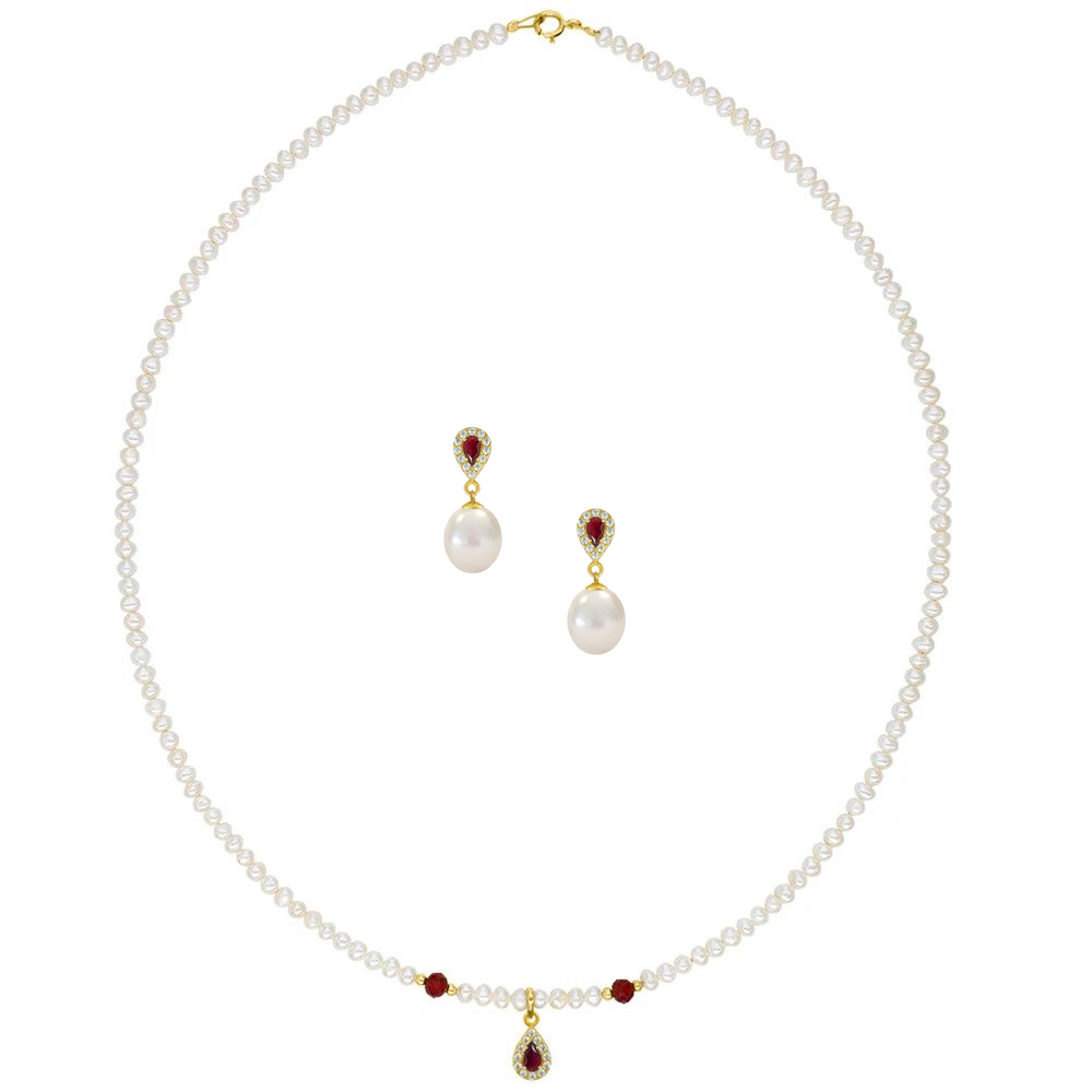 Σετ κολιέ και σκουλαρίκια με Κ14 χρυσά στοιχεία, λευκά μαργαριτάρια και κόκκινα ζιργκόν - S124257RS