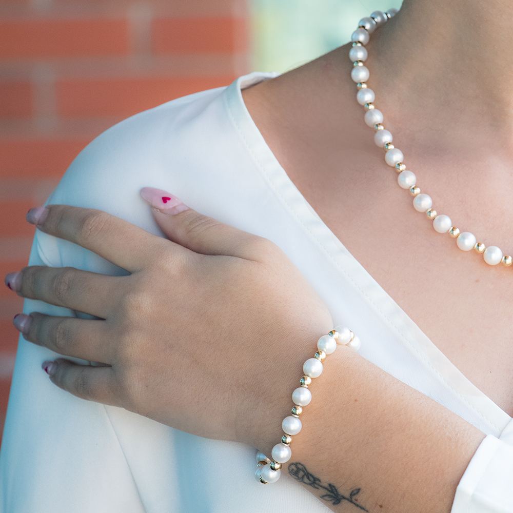 Σετ κολιέ και βραχιόλι με Κ14 χρυσά στοιχεία με λευκά μαργαριτάρια - S124986