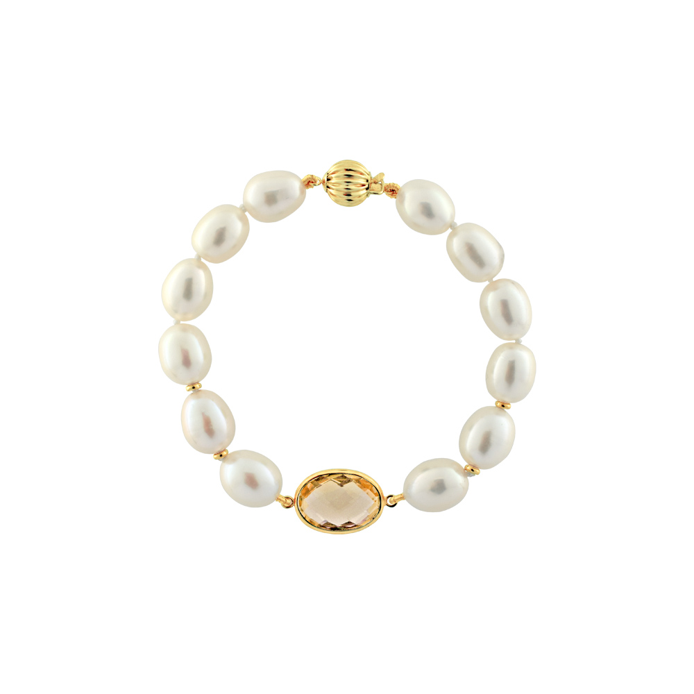2. Ένα υπέροχο βραχιόλι με λευκά μαργαριτάρια γλυκού νερού Fresh Water Pearl διαμέτρου 9 x 11 χιλιοστών, άριστης ποιότητας σε σχήμα Drop (σταγόνα). Στο κέντρο του υπάρχει 1 λαμπερό Citrine (φυσικός ορυκτός λίθος) διαμέτρου 11,5 x 15 χιλιοστά σε χρυσό καστόνι 14 καρατίων. Διαθέτει επίσης 4 χρυσά στοιχεία 14 καρατίων καθώς και χρυσό κούμπωμα ασφαλείας 14 καρατίων. Το μήκος του είναι 18 - 19 εκατοστά, όμως μπορείτε να το παραγγείλετε σε όποιο μήκος επιθυμείτε.