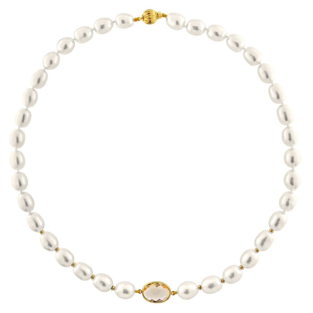 1. Ένα υπέροχο κολιέ με λευκά μαργαριτάρια γλυκού νερού Fresh Water Pearl διαμέτρου 9 x 11 χιλιοστών, άριστης ποιότητας σε σχήμα Drop (σταγόνα). Στο κέντρο του υπάρχει 1 λαμπερό Citrine (φυσικός ορυκτός λίθος) διαμέτρου 11,5 x 15 χιλιοστά σε χρυσό καστόνι 14 καρατίων. Διαθέτει επίσης 4 χρυσά στοιχεία 14 καρατίων καθώς και χρυσό κούμπωμα ασφαλείας 14 καρατίων. Το μήκος του είναι 43 - 45 εκατοστά, όμως μπορείτε να το παραγγείλετε σε όποιο μήκος επιθυμείτε.
